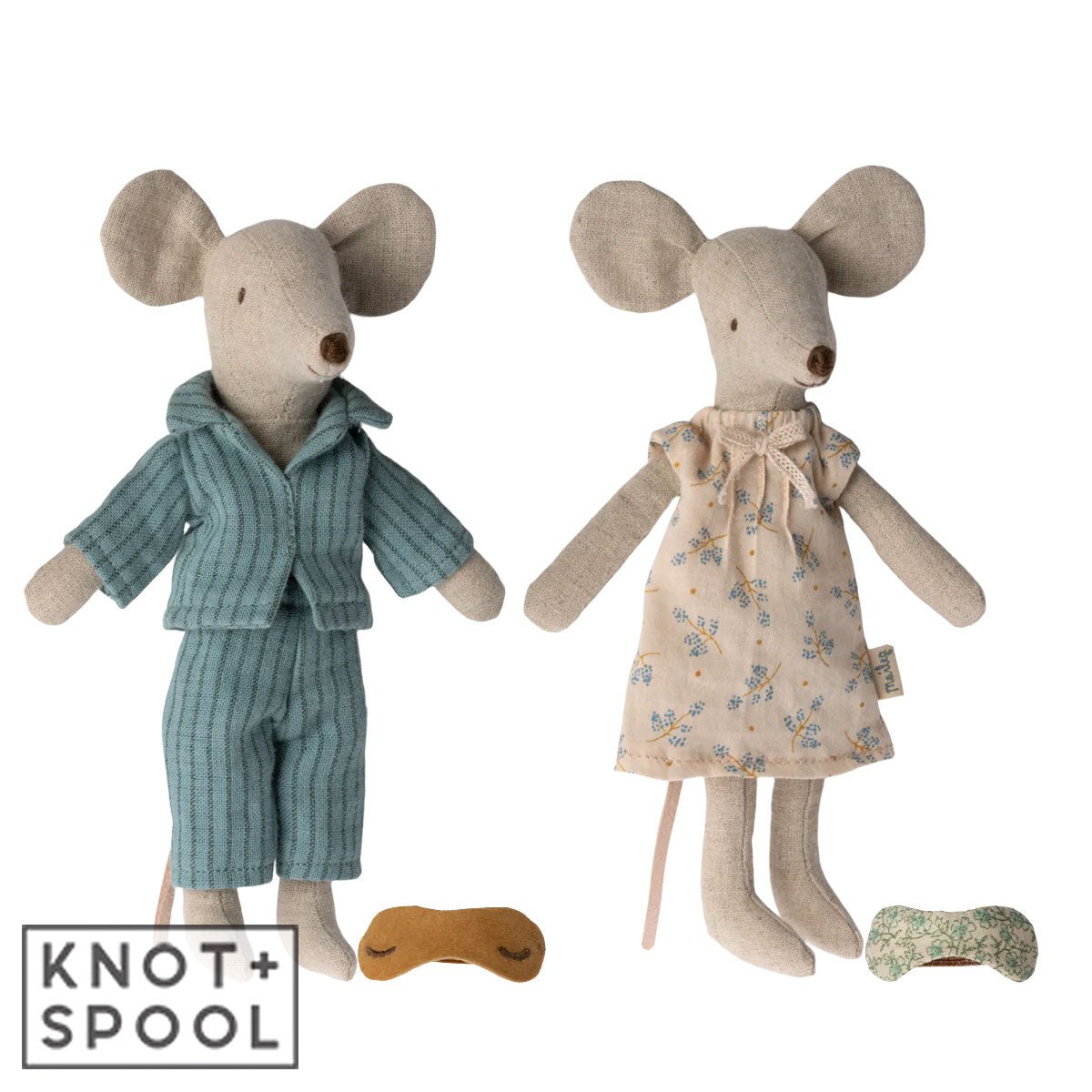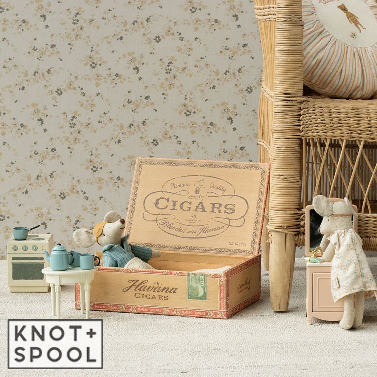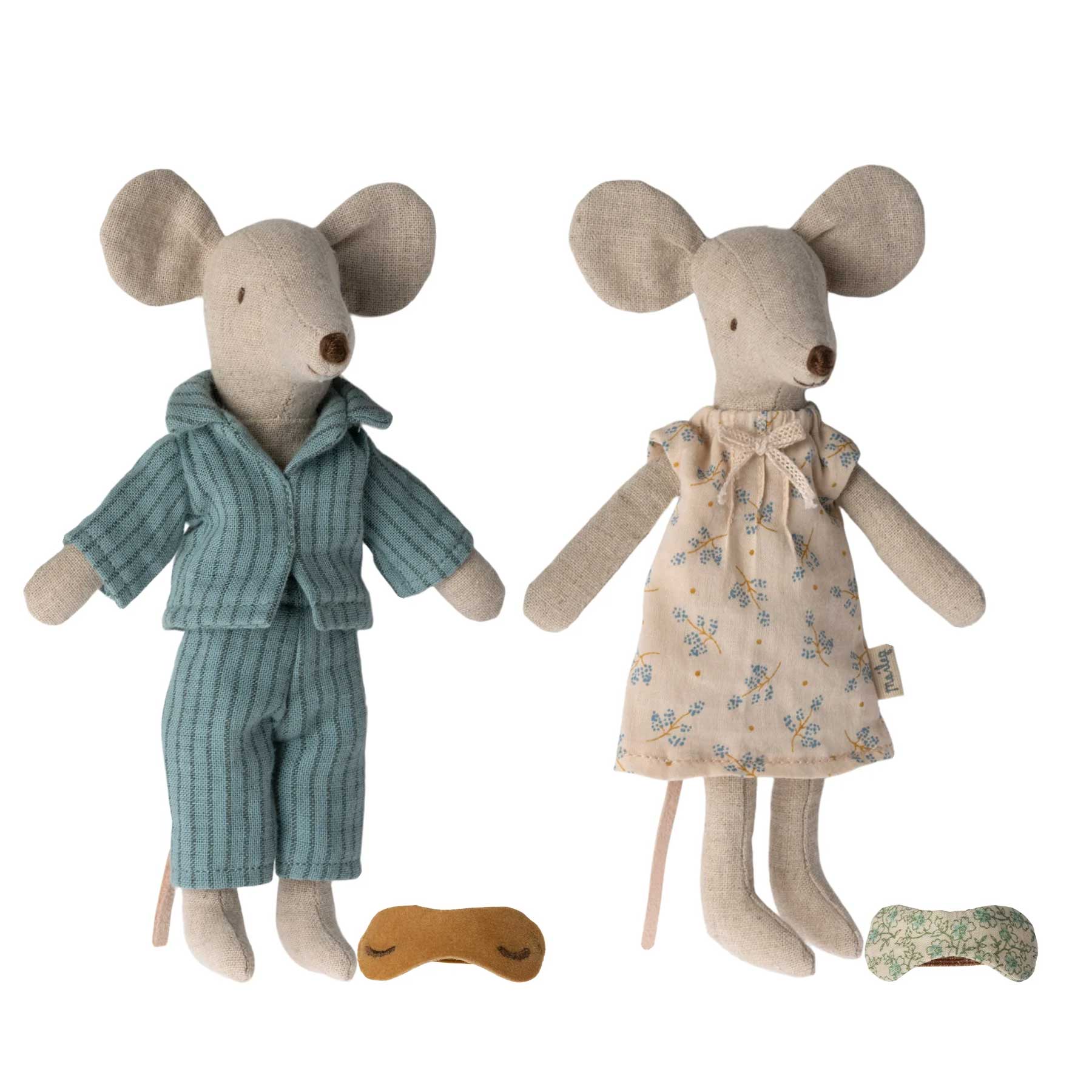 The Maileg Mum and Dad Mice are ready for a cozy night’s sleep in their charming cigar box bed. Dressed in soft nightwear with matching eye masks, they bring classic Maileg charm to bedtime routines and imaginative play. The beautifully designed bed linen inside the box adds a touch of whimsy—each set is unique, making every bedtime story extra special.