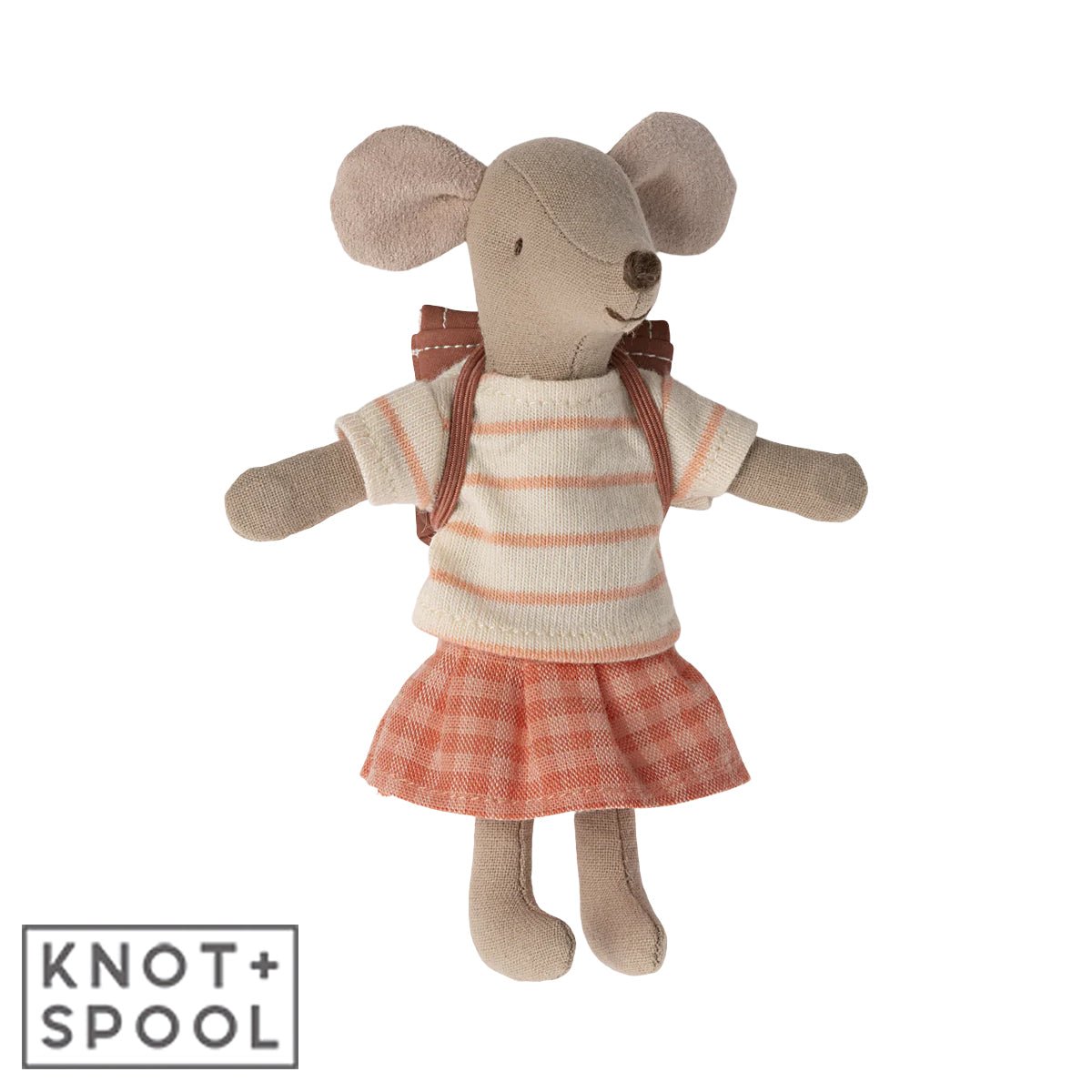 Meet the Maileg Big Sister Coral Tricycle Mouse, the perfect companion for your child's imaginative adventures. Dressed for a fun day in kindergarten or school, she comes with a charming backpack and ready to ride her tricycle. The magnets in her hands ensure she grips the handles tightly for a safe and exciting trip.