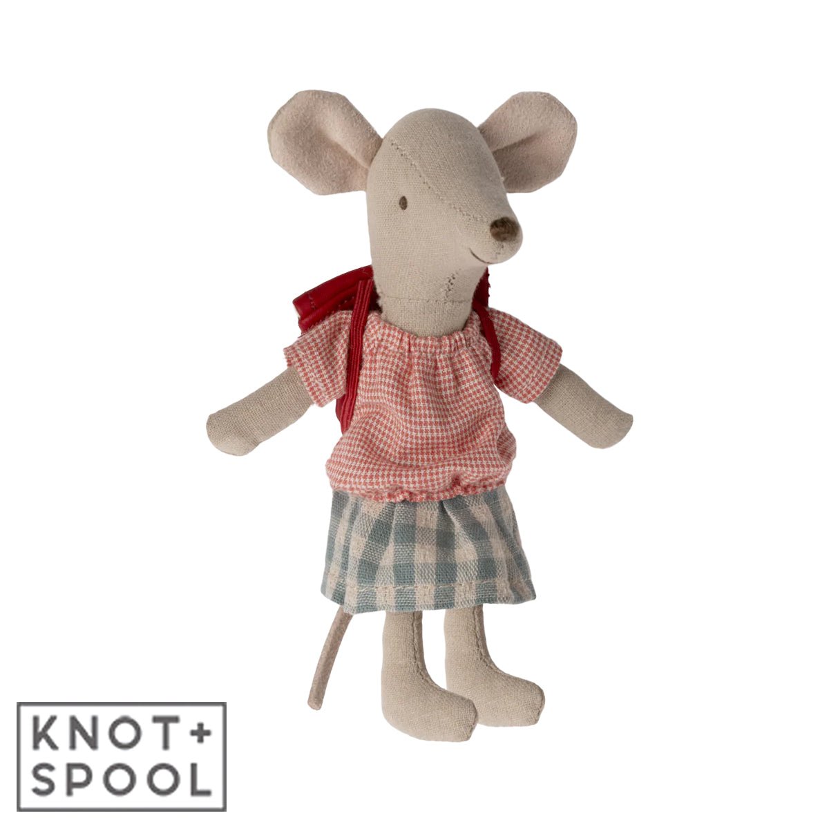 Meet the Maileg Big Sister Red Tricycle Mouse, the perfect companion for your child's imaginative adventures. Dressed for a fun day in kindergarten or school, she comes with a charming backpack and is ready to ride her tricycle. The magnets in her hands ensure she grips the handles tightly for a safe and exciting trip.