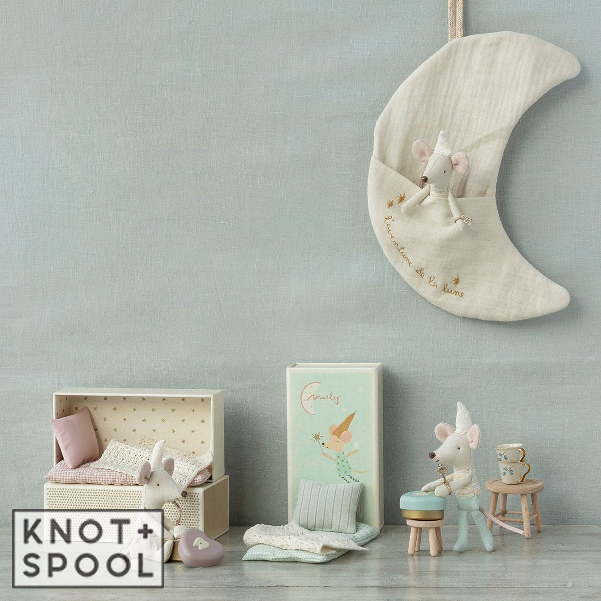 When day turns into night, the moon will shine and make everyone feel safe. This soft moon is perfect for decorating a child's room. It has a small pocket to store your tooth fairy and lovely embroidery on the front.