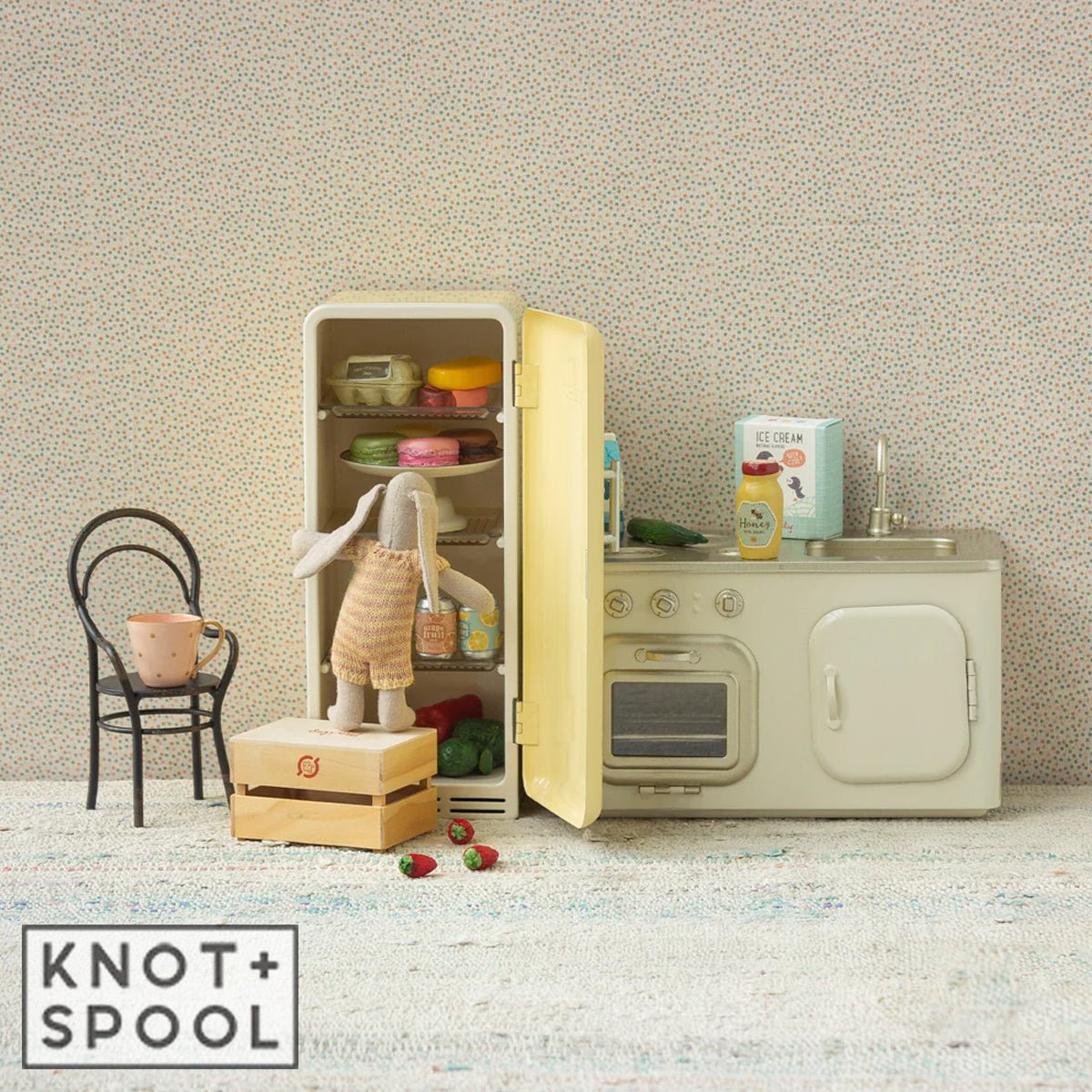 Complete your dollhouse kitchen scene with our Miniature Grocery Box (sold separately), the perfect addition to accompany the 2024 Maileg Miniature Fridge. Fill the fridge with tiny fruits, vegetables, and other food items from the grocery box to create a realistic and enticing display.