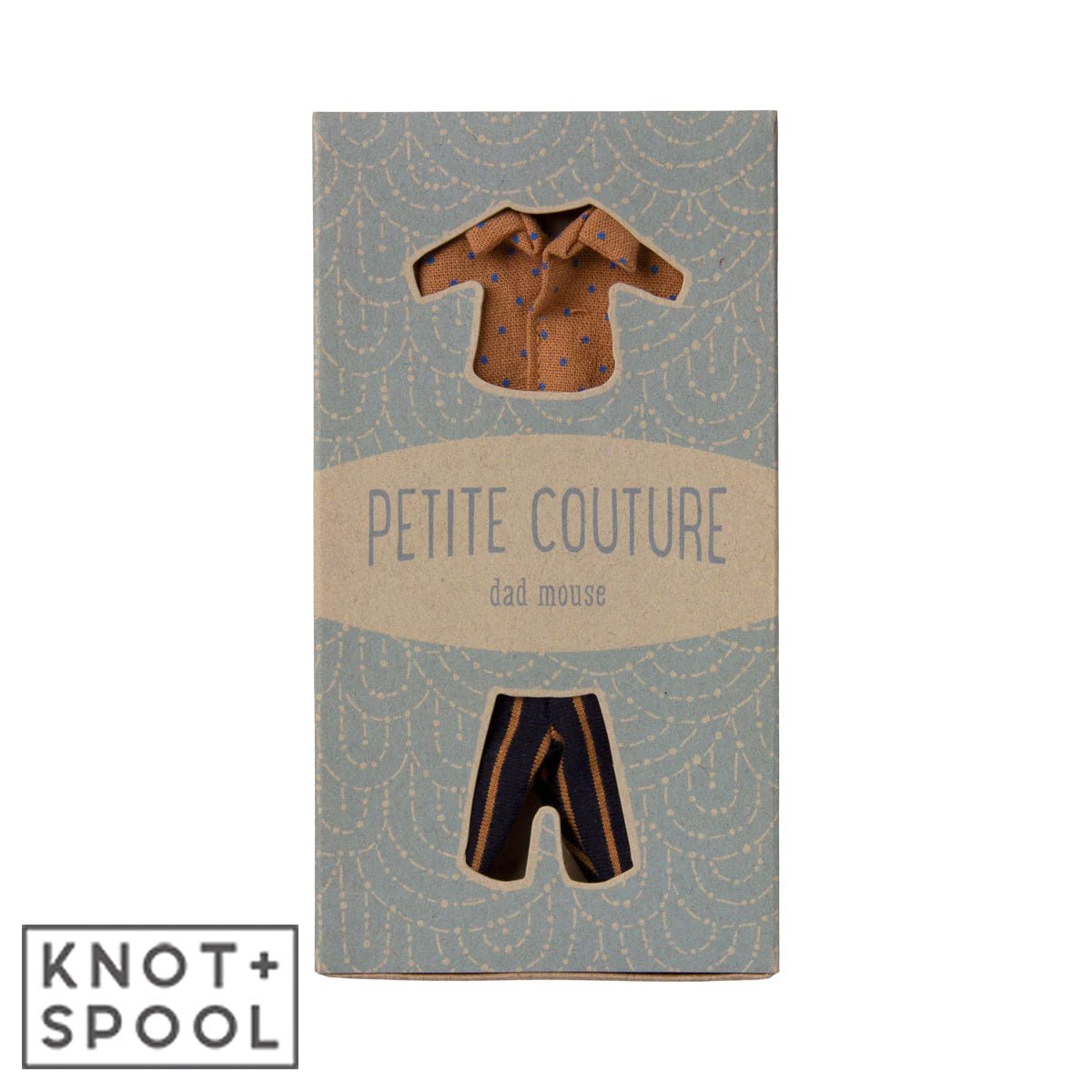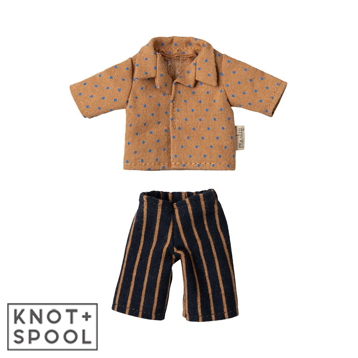Give your Maileg Dad Mouse a fresh new look with this stylish outfit. This Maileg mouse outfit includes a classic dotted shirt paired with striped pants, creating a timeless and charming look. Perfect for dress-up and storytelling, this set is a great addition to any Maileg mouse clothes collection.