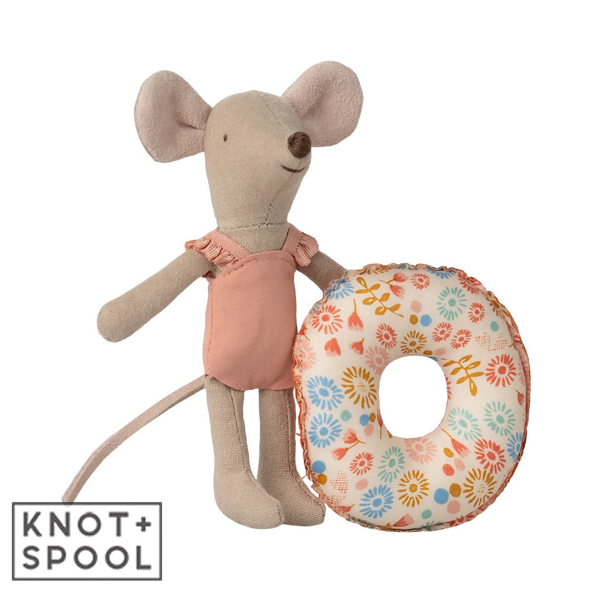 The Maileg Little Sister Beach Mouse is ready for a day of fun in the sun! Wearing a rose-colored swimsuit and a charming flower-print float around her waist, this Maileg Mouse is perfect for seaside stories and summertime play.
