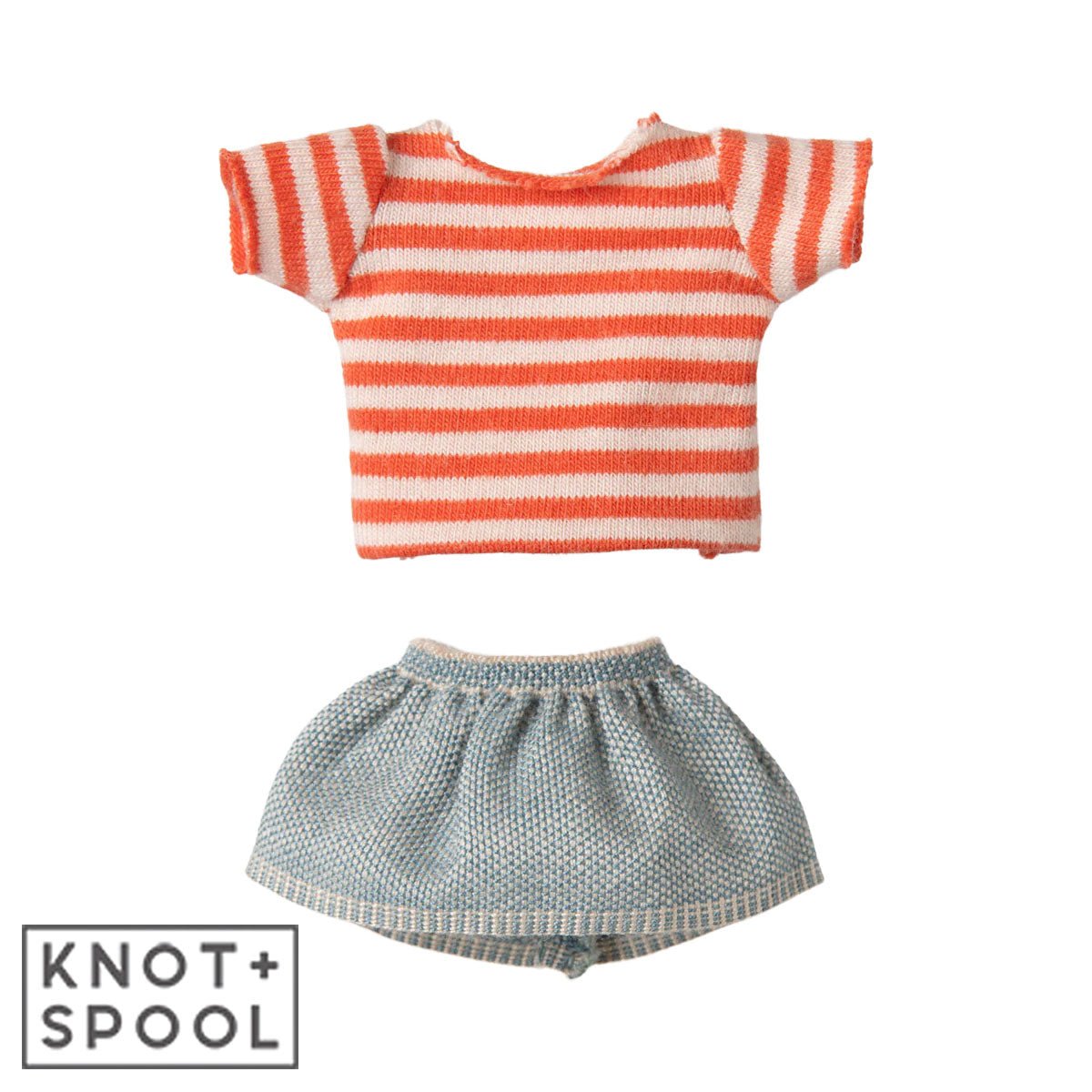 - Adorably dressed in a red striped t-shirt and denim skirt.