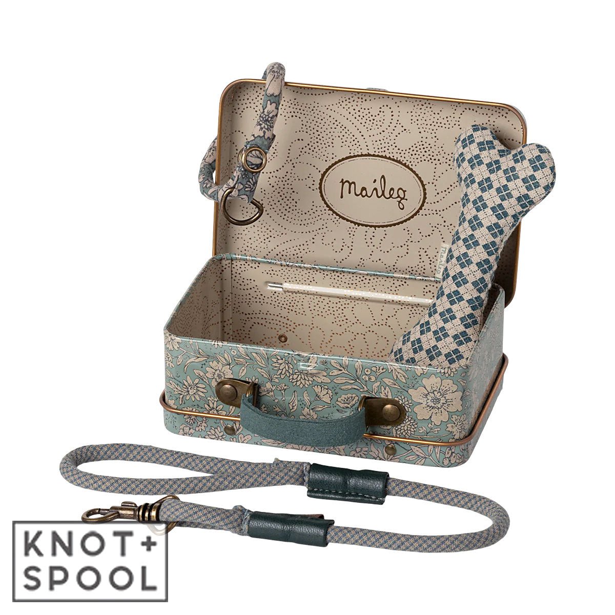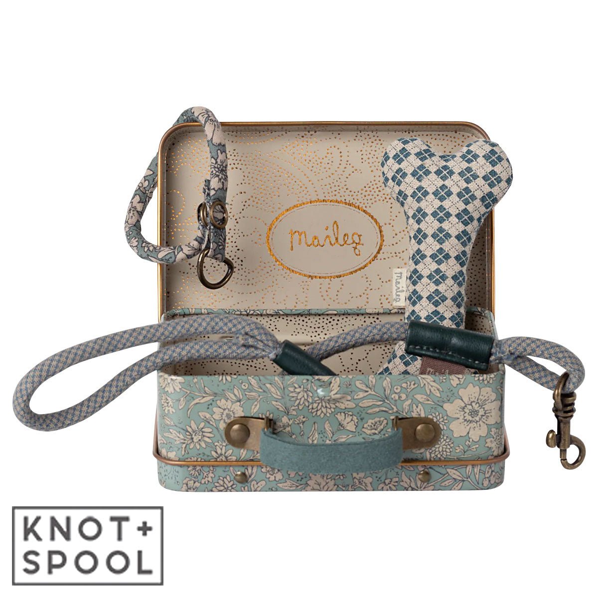 Every puppy needs the right accessories, and the Maileg Puppy Supply Blue Accessories set has everything to keep your plush pup happy! This charming set includes a soft bone, a stylish collar, and a leash, all neatly packed in a beautifully printed Maileg metal suitcase. Whether you're taking your Maileg stuffed animal on an adventure or tucking them in for a cozy nap, this set is a must-have for any little pet lover.