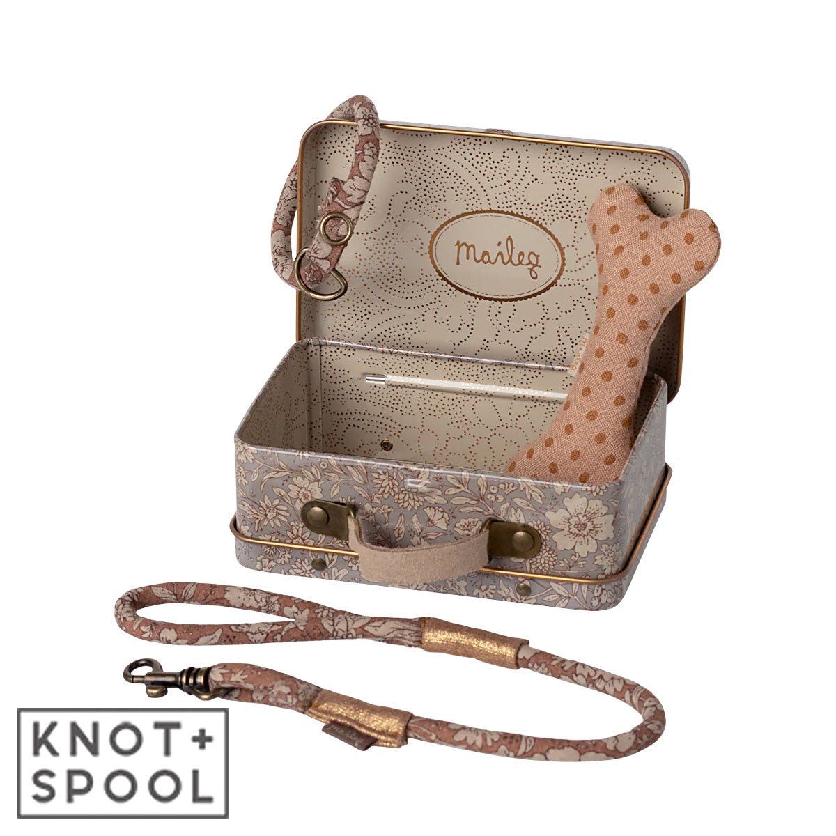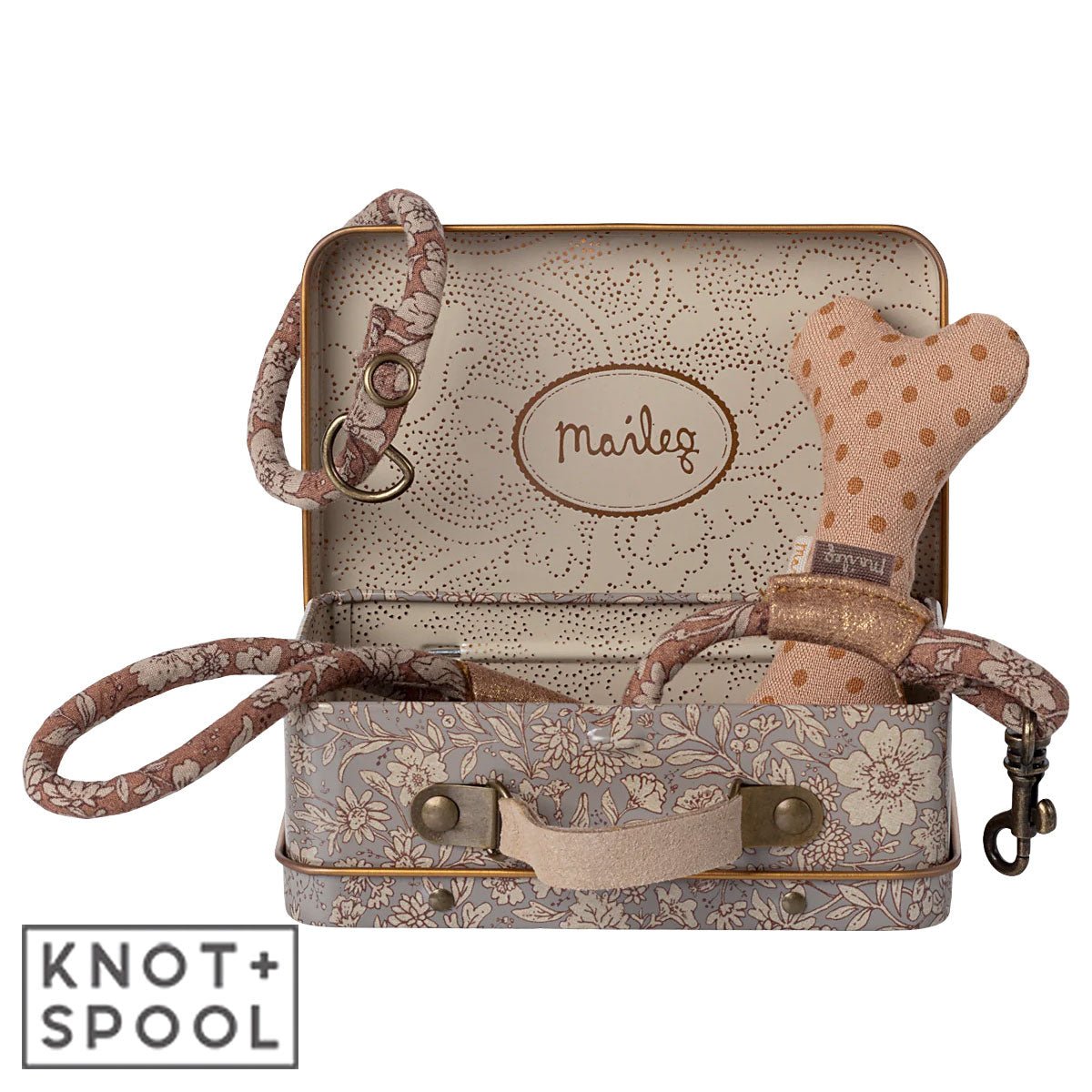 Every puppy deserves the perfect accessories! The Maileg Puppy Supply Rose Accessories set includes everything your plush pup needs—a soft bone, a stylish collar, and a leash—all neatly packed in a charming Maileg metal suitcase. Designed in a lovely rose color, this set is a must-have for little pet lovers who adore their Maileg stuffed animals.