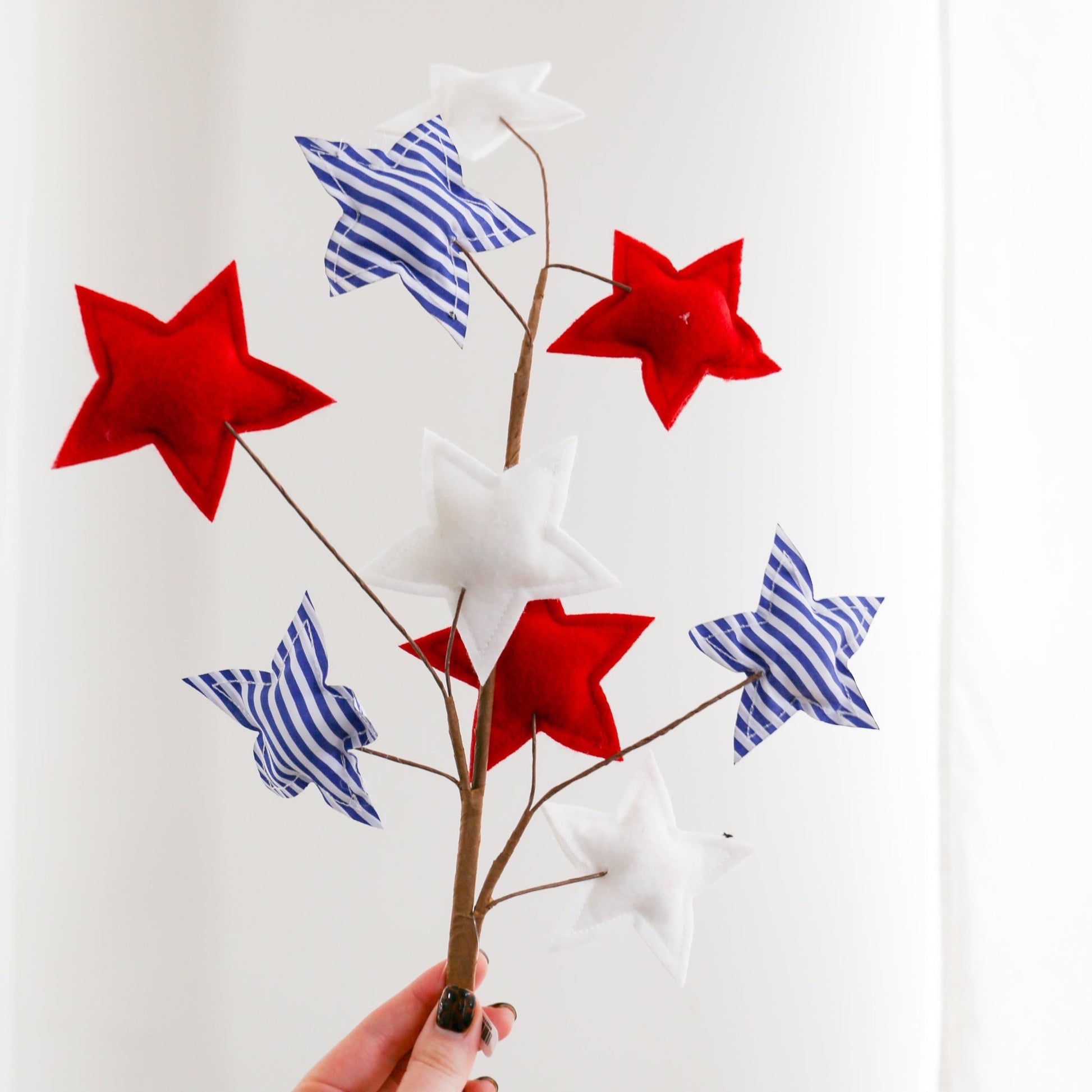 Celebrate your love for red, white, and blue with our Patriotic Plush Star Spray! This eye-catching decorative spray features soft plush stars in red, white, and blue, some with classic stripes, making it the perfect accent for patriotic-themed home décor.