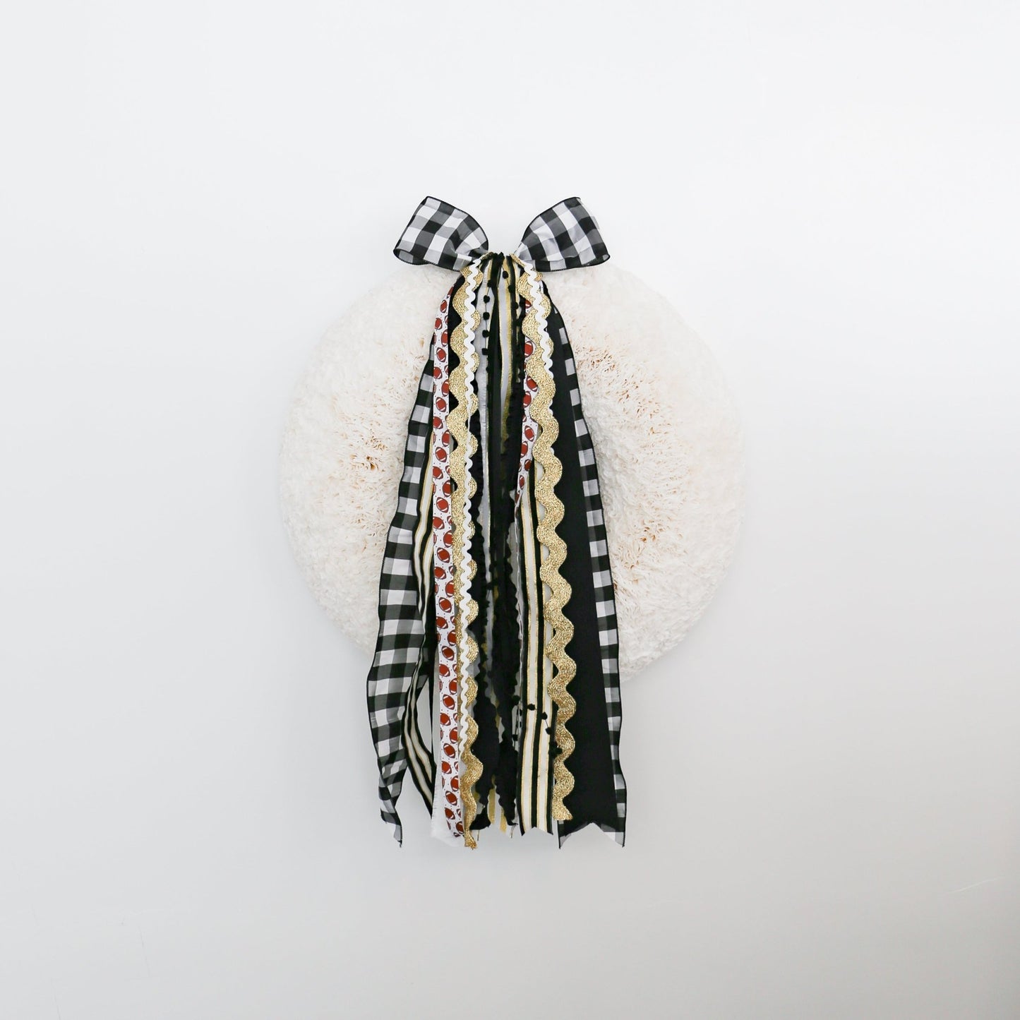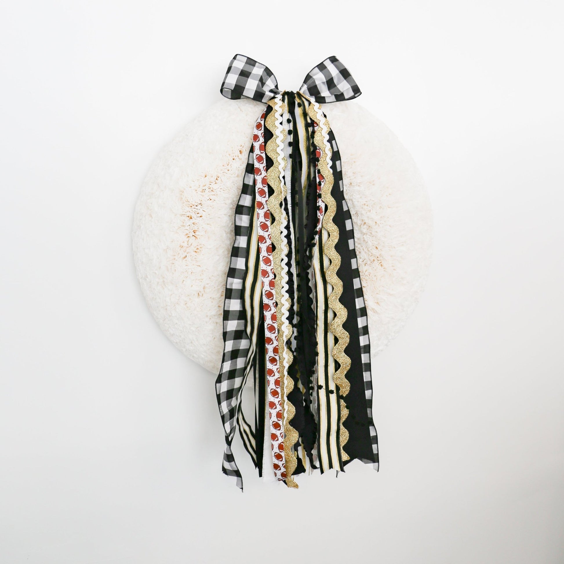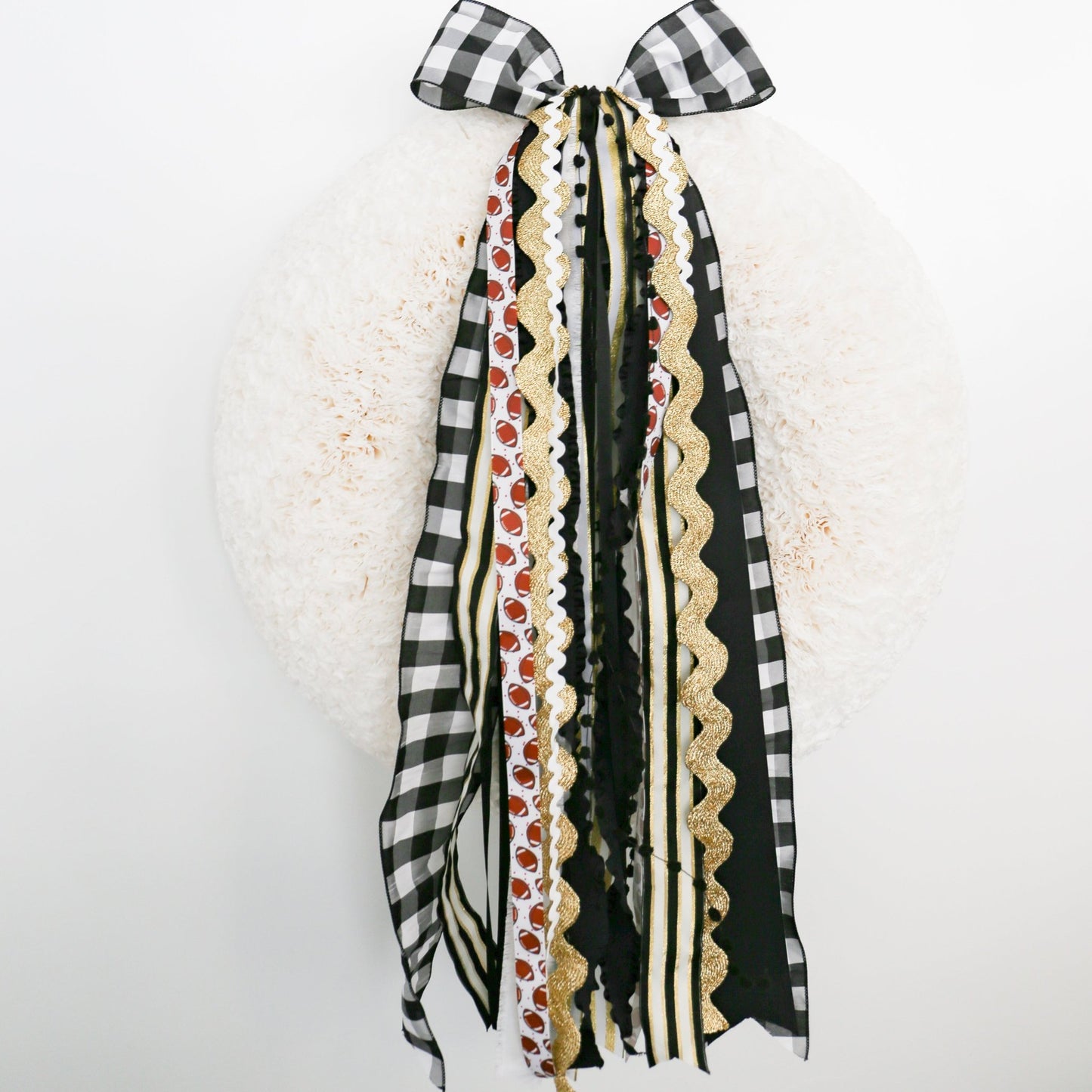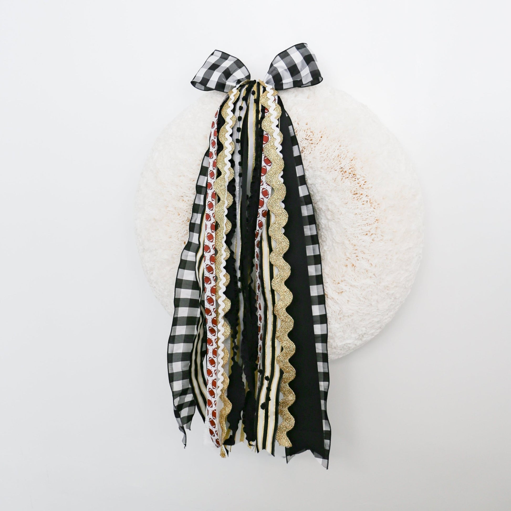 Black & Gold RIBBON SET™ (with Bow). This bold and spirited set is made to stand out on game day! The bow features a classic black-and-white gingham check, paired with a glittering gold striped ribbon for a winning combo. A shimmering gold ric rac adds the perfect finishing touch of shine. Whether you're rooting for Highland High School, Cottonwood High School, Desert Hills High School, or Roy High School, this set is full of pride and ready to cheer on your team in style.