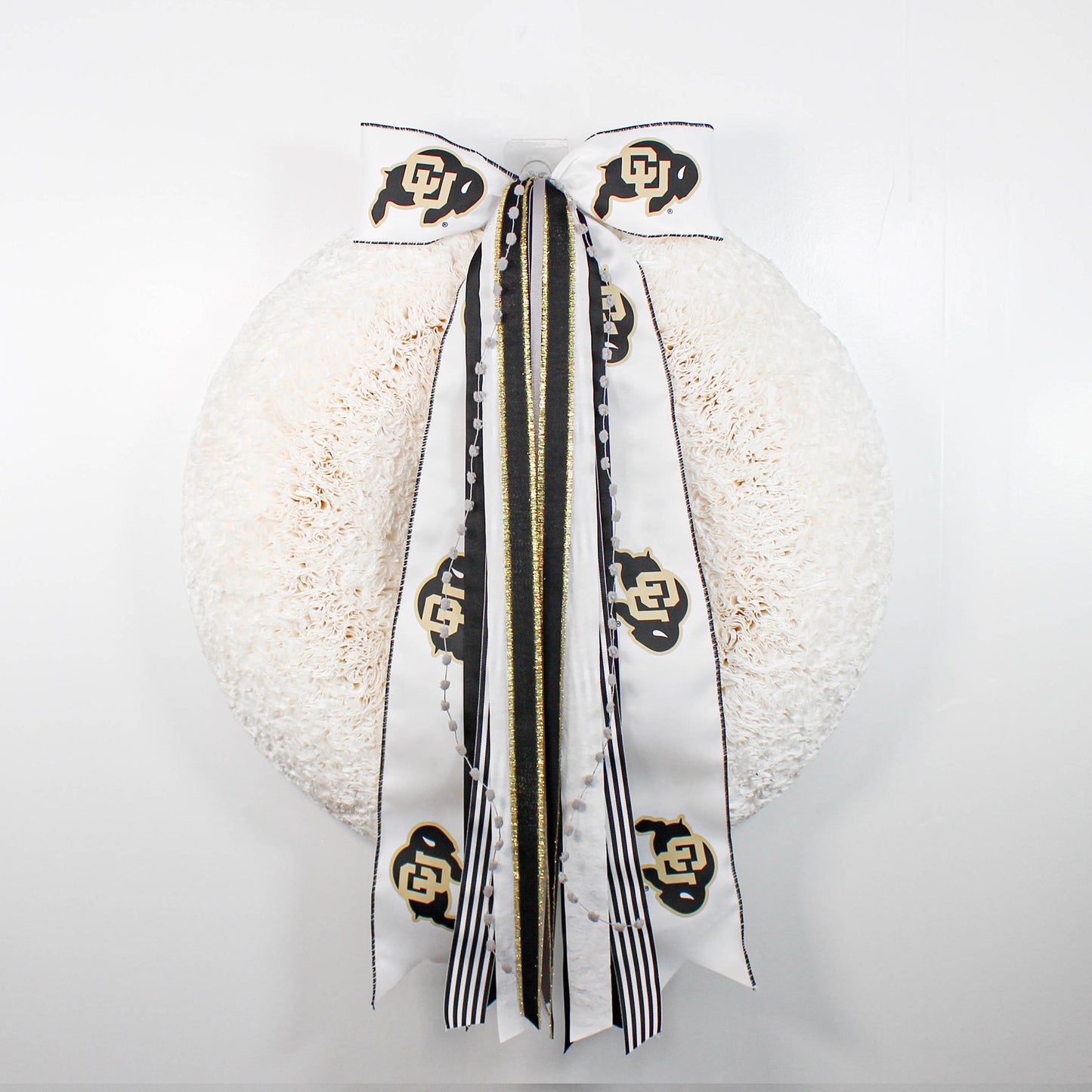 Gear up for game days and celebrate year-round with the exclusive Colorado Buffaloes Ribbon Set with Bow. As an Officially Licensed Collegiate Vendor, Knot + Spool is proud to offer this unique ribbon set that embodies the bold spirit and pride of the University of Colorado. Perfect for fans who want to display their loyalty with style, this ribbon set captures the essence of the Buffaloes in every detail.