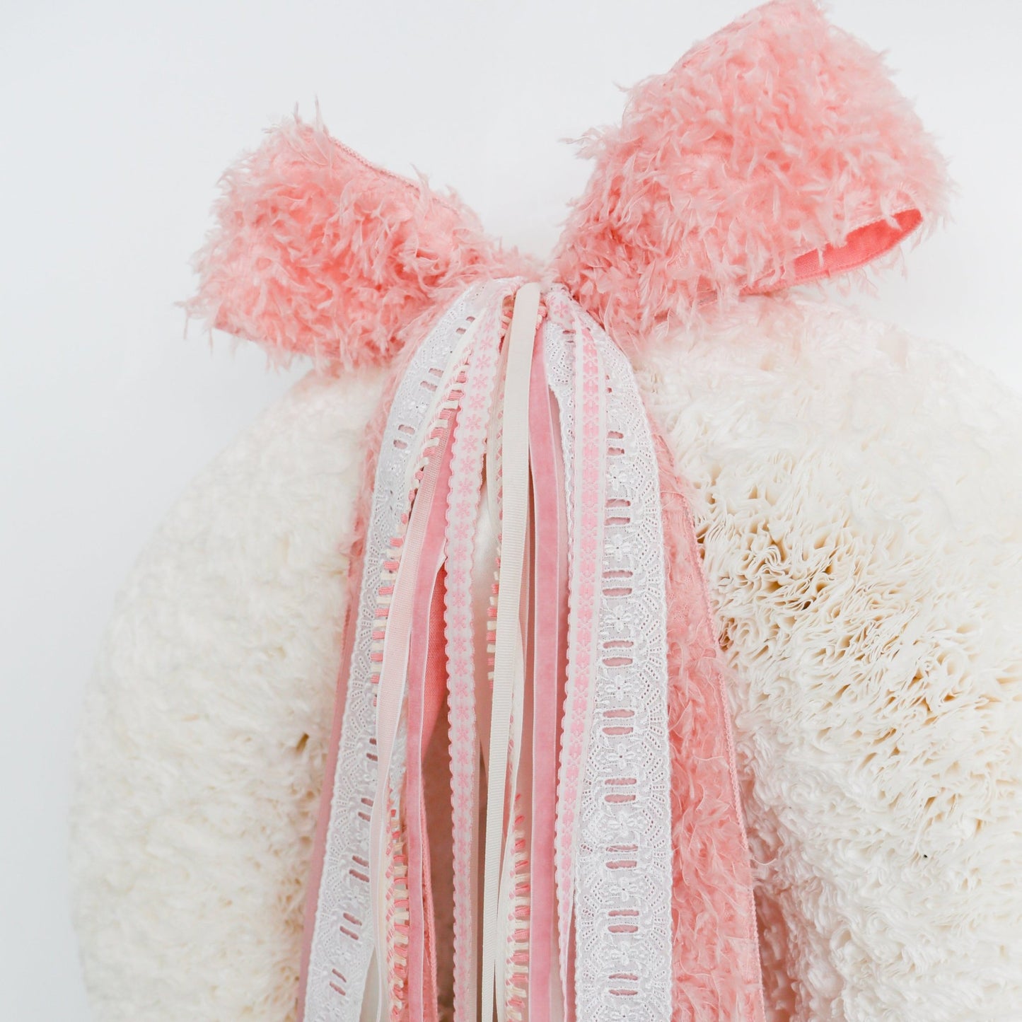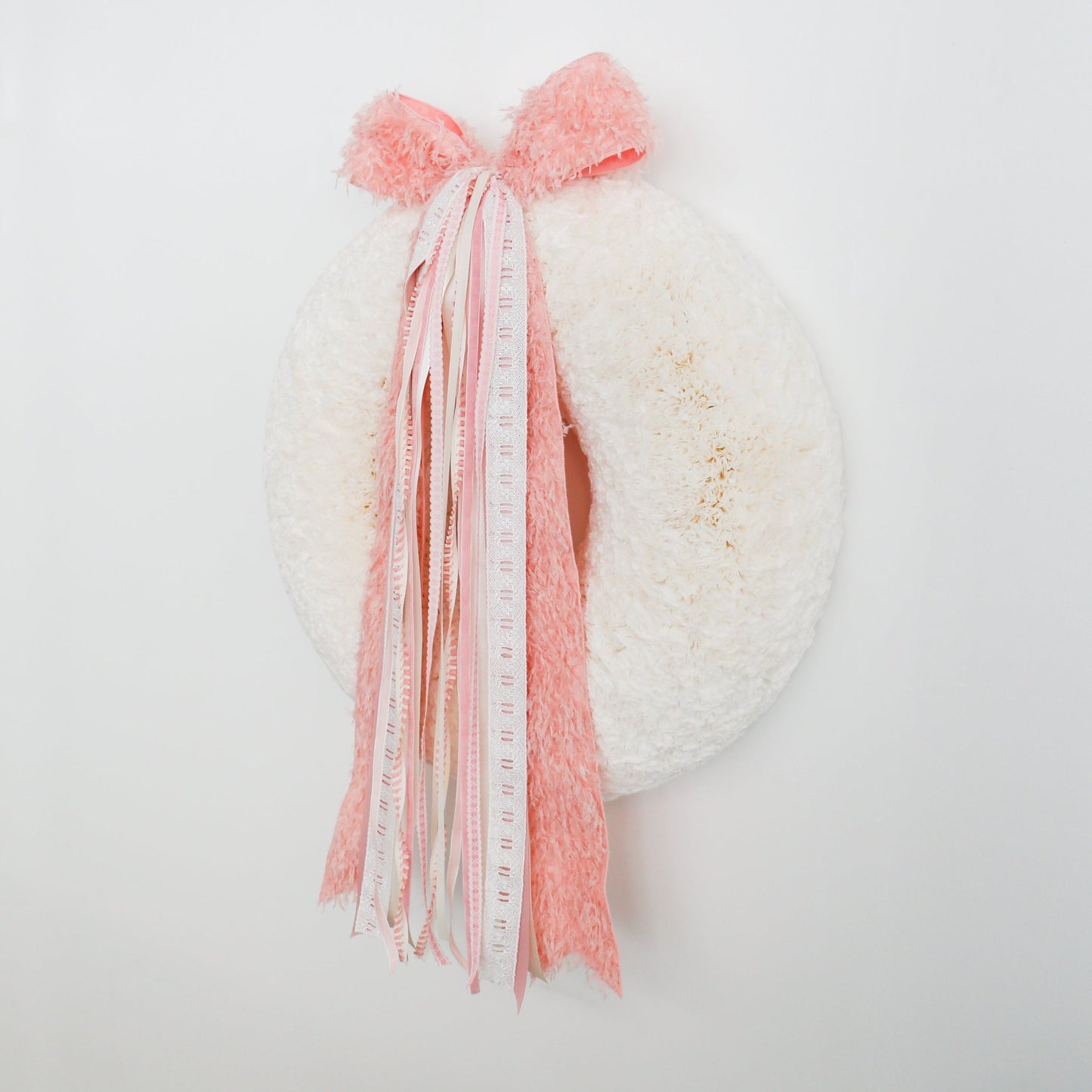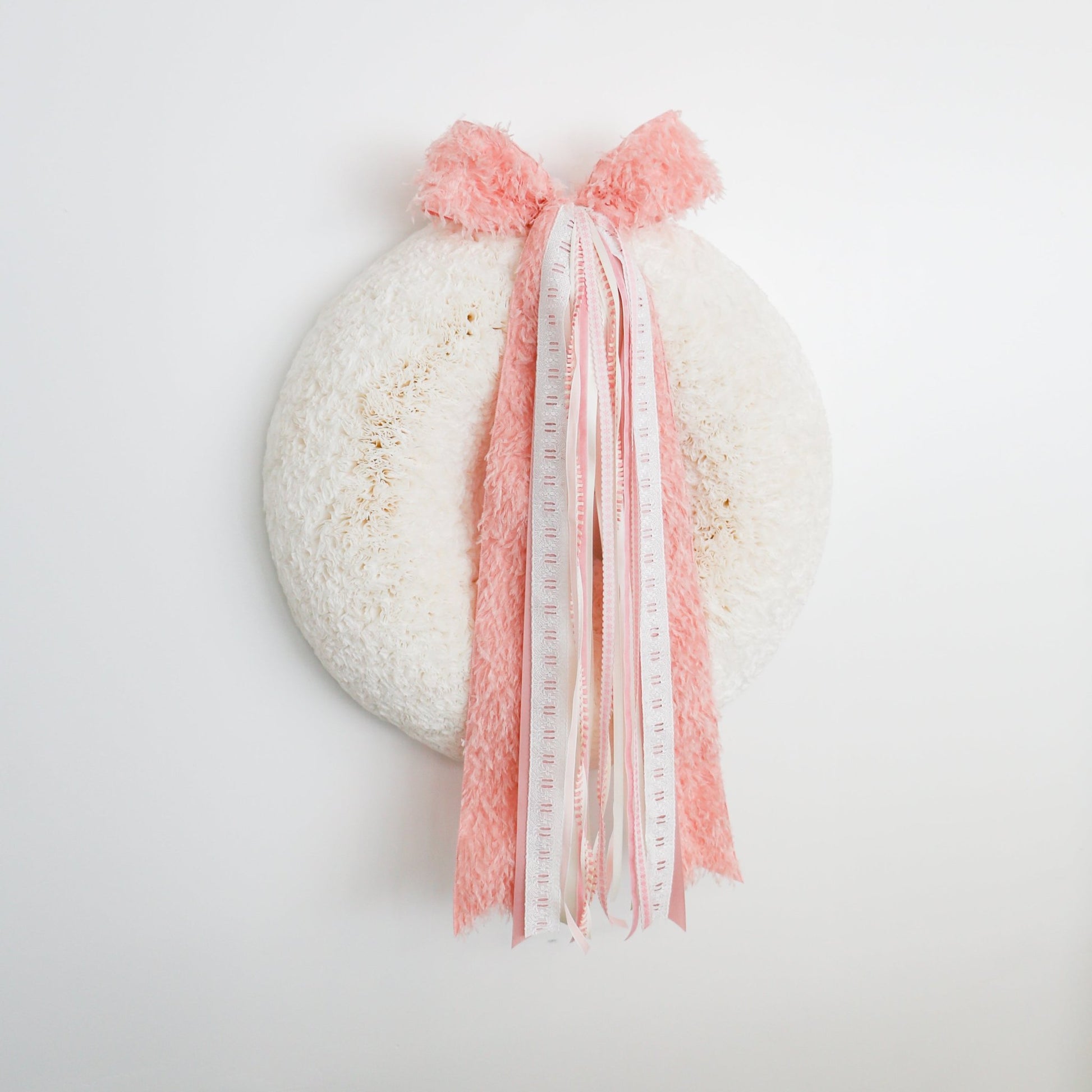 Love Birds RIBBON SET™ (with Bow). The back ribbon features a delicate feather design that inspired this set. Filled with soft pinks and creamy hues, the dainty details are truly captivating. With a velvet pink ribbon, an embroidered pink flower on lace, and a cream and pink tassel ribbon, this set reaches new heights of elegance. As charming as new love, it holds a special place in the heart.