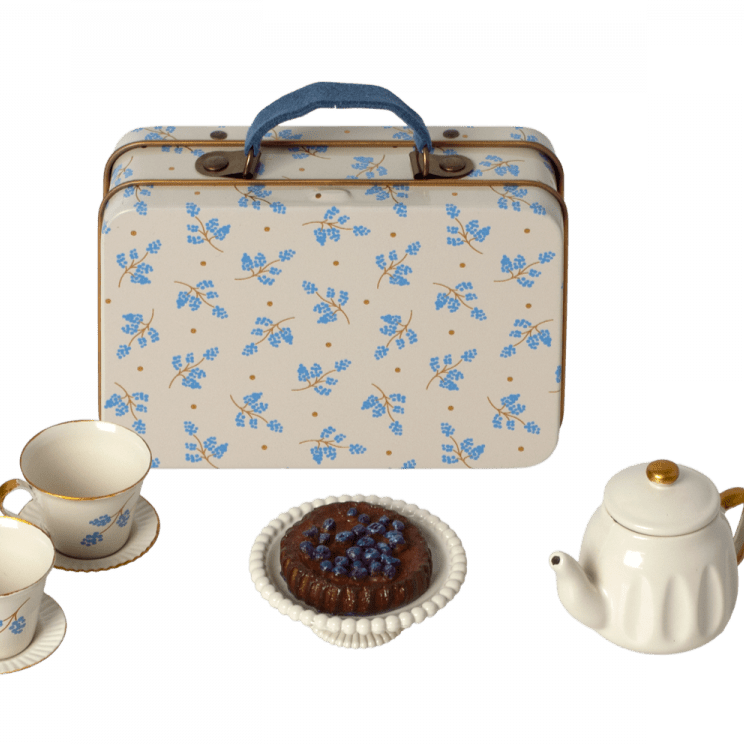 Create magical tea parties, engage in imaginative play, and spark joy with the Maileg Afternoon Treat, Mouse - Blue Madelaine Tea Set. Crafted with care and attention to detail, this tea set is perfect for enhancing playtime and adding a touch of whimsy to any Maileg collection. Please note that the mouse is not included, allowing you to pair this delightful set with your favorite Maileg mouse or create your own imaginative tea party guest. Let the tea time adventures begin!