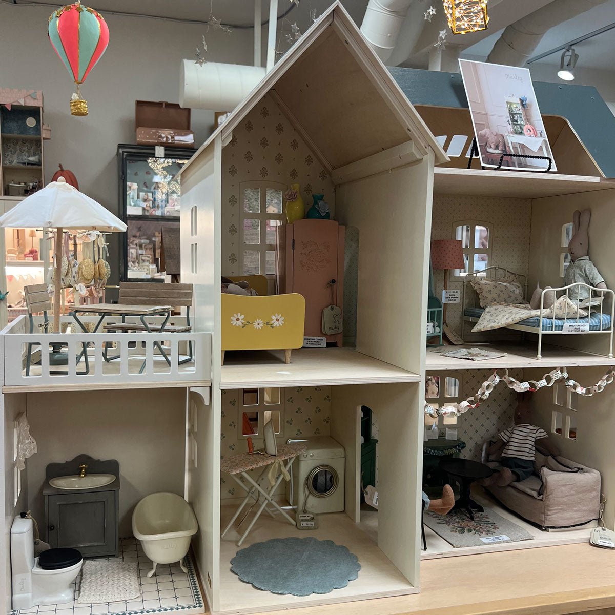 The beloved Maileg Dollhouse is back with beautifully decorated walls and an updated design! This charming wooden home is perfect for your Maileg Miniature world, fitting Maileg Bunnies, Rabbits (sizes 1, 2, Micro, and My), and the Teddy family.