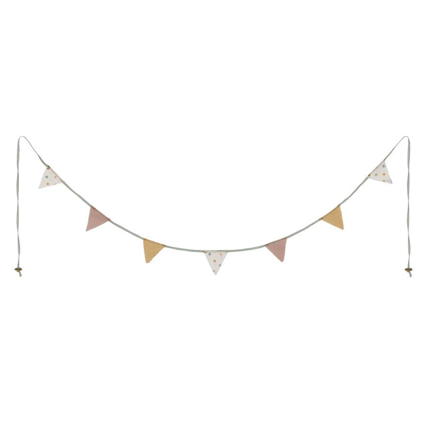 Brighten up your Maileg Home Decor with the Maileg Miniature Garland β a whimsical string of soft cotton flags designed to bring charm and celebration into every miniature space. Whether hung in the living room or stretched across the terrace, this Maileg Garland adds playful detail to your dollhouse world.
