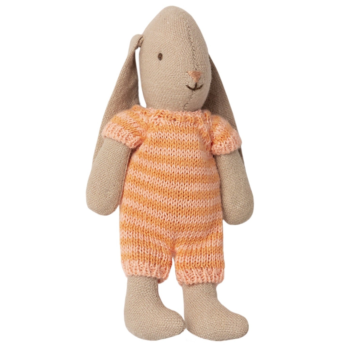 A Tiny Treasure: The Maileg Peach Micro Bunny is a delightful companion for any Maileg Bunny collection. Dressed in a soft knitted striped suit made from a cozy linen-cotton blend, this sweet little bunny is perfect for hours of imaginative play.