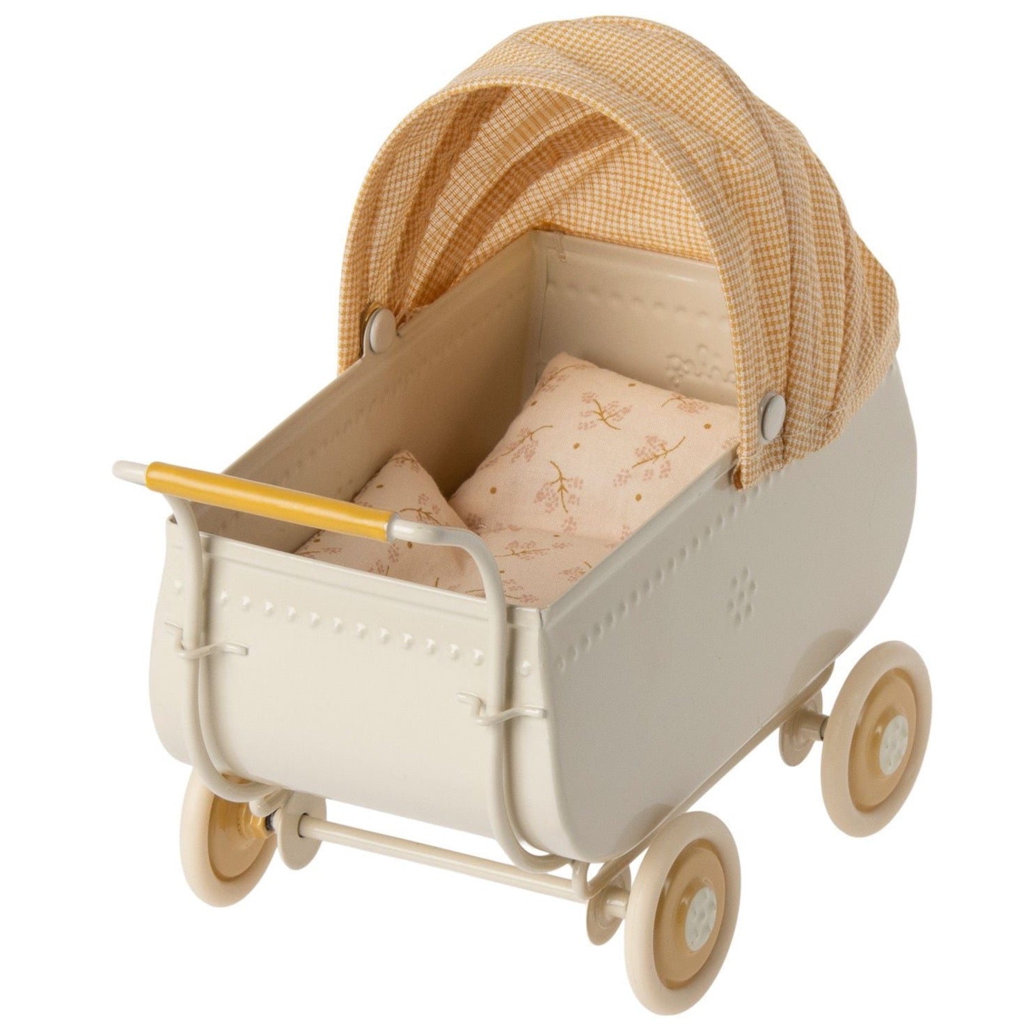 Bring a touch of vintage charm to playtime with the Maileg Yellow Micro Pram—the perfect Baby Carriage for tiny adventures!