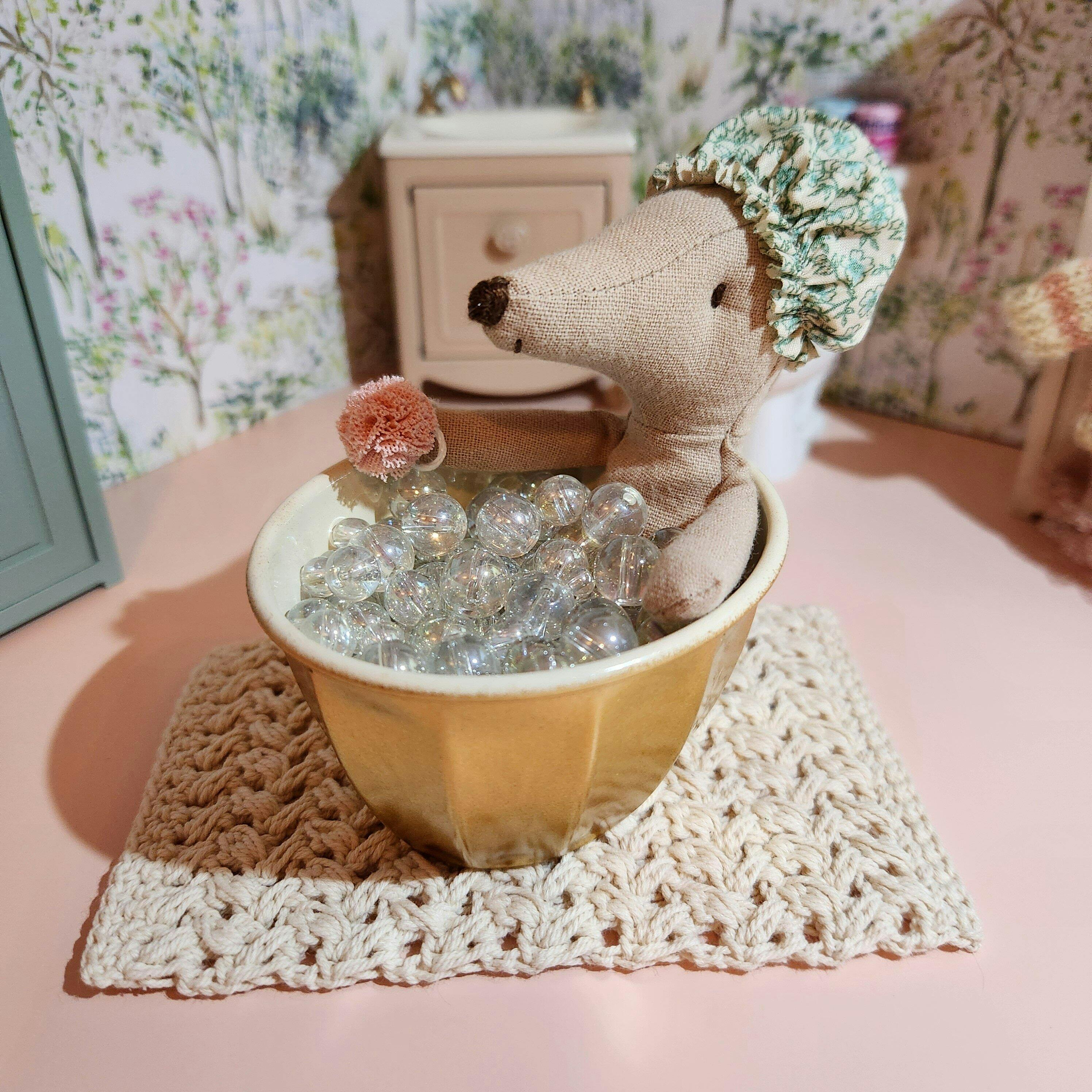 Rub a dub dub, there's a tiny mouse in the tub! This delightful Big Sister Wellness Mouse is ready for some squeaky-clean fun. Dressed in her charming polka-dot shower cap, Ms. Mouse is ready to dive into her miniature bathtub and indulge in a relaxing bath. But don't worry, her ears will stay dry and cozy under the cap.