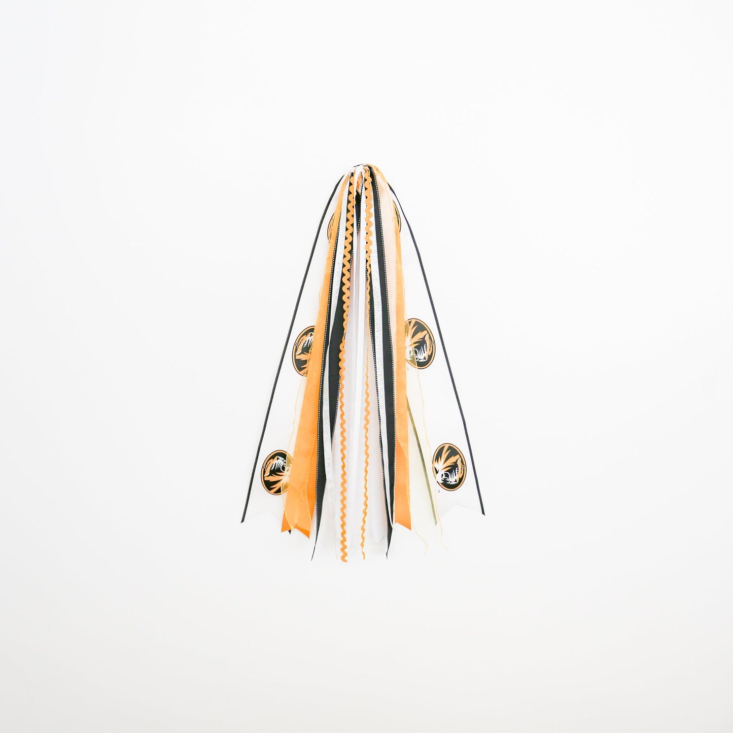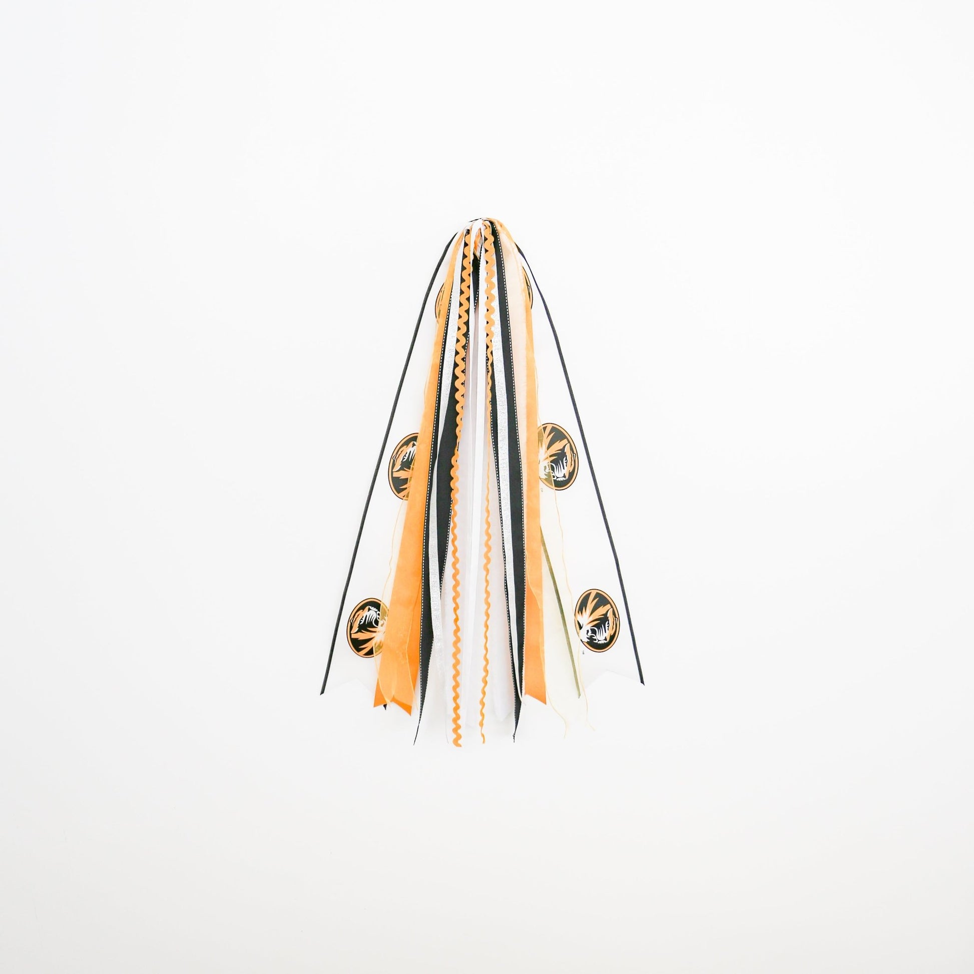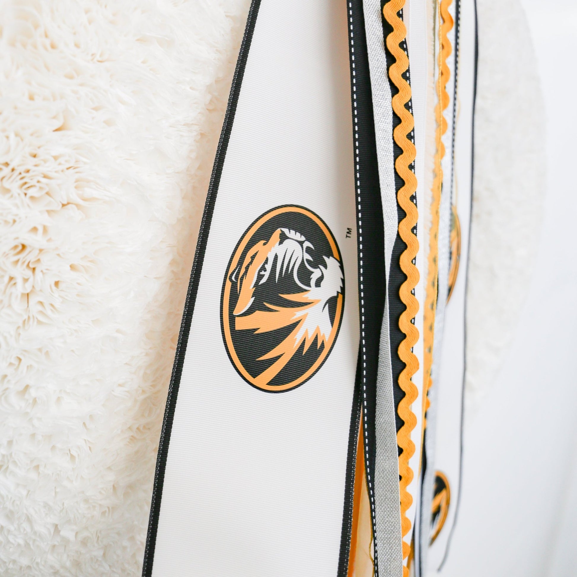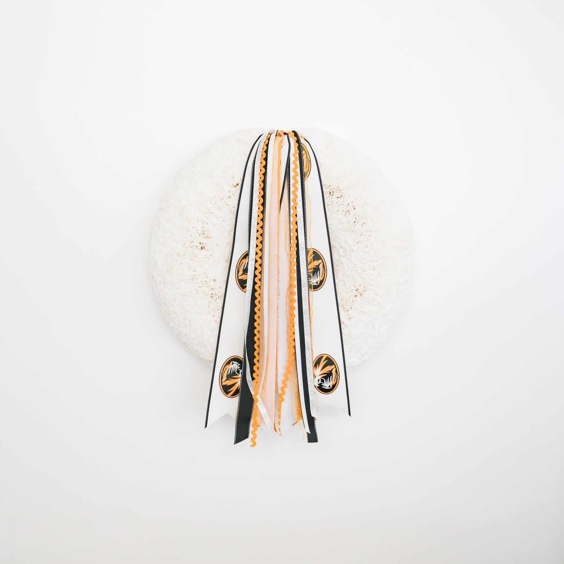 Featuring the iconic black and gold of the Missouri Tigers, this ribbon set is a stunning addition to any space. Without a bow, it offers a clean and versatile design that enhances your decor while keeping the focus on your Tiger pride. Use it to decorate your front door, entryway, or any area you want to highlight with school spirit.