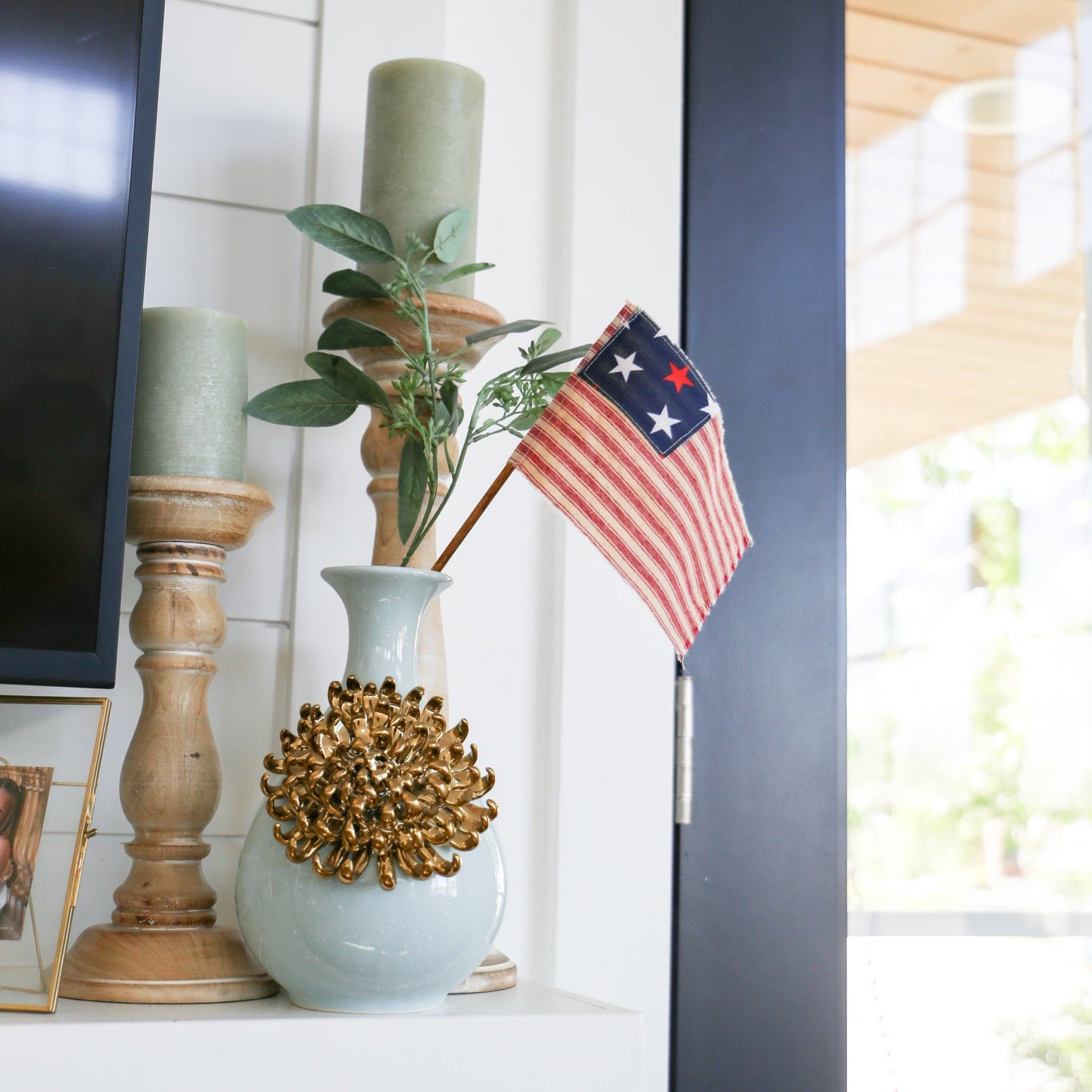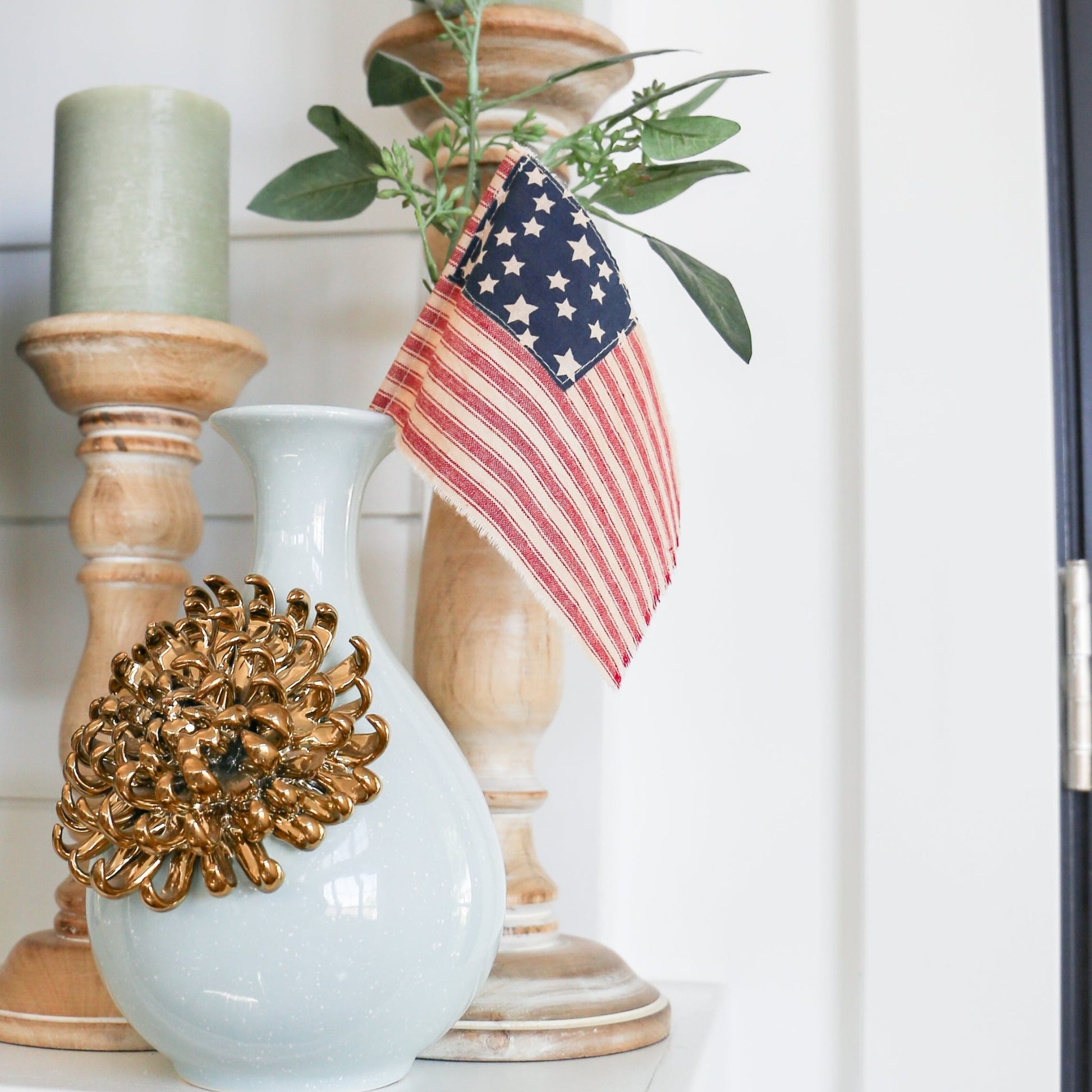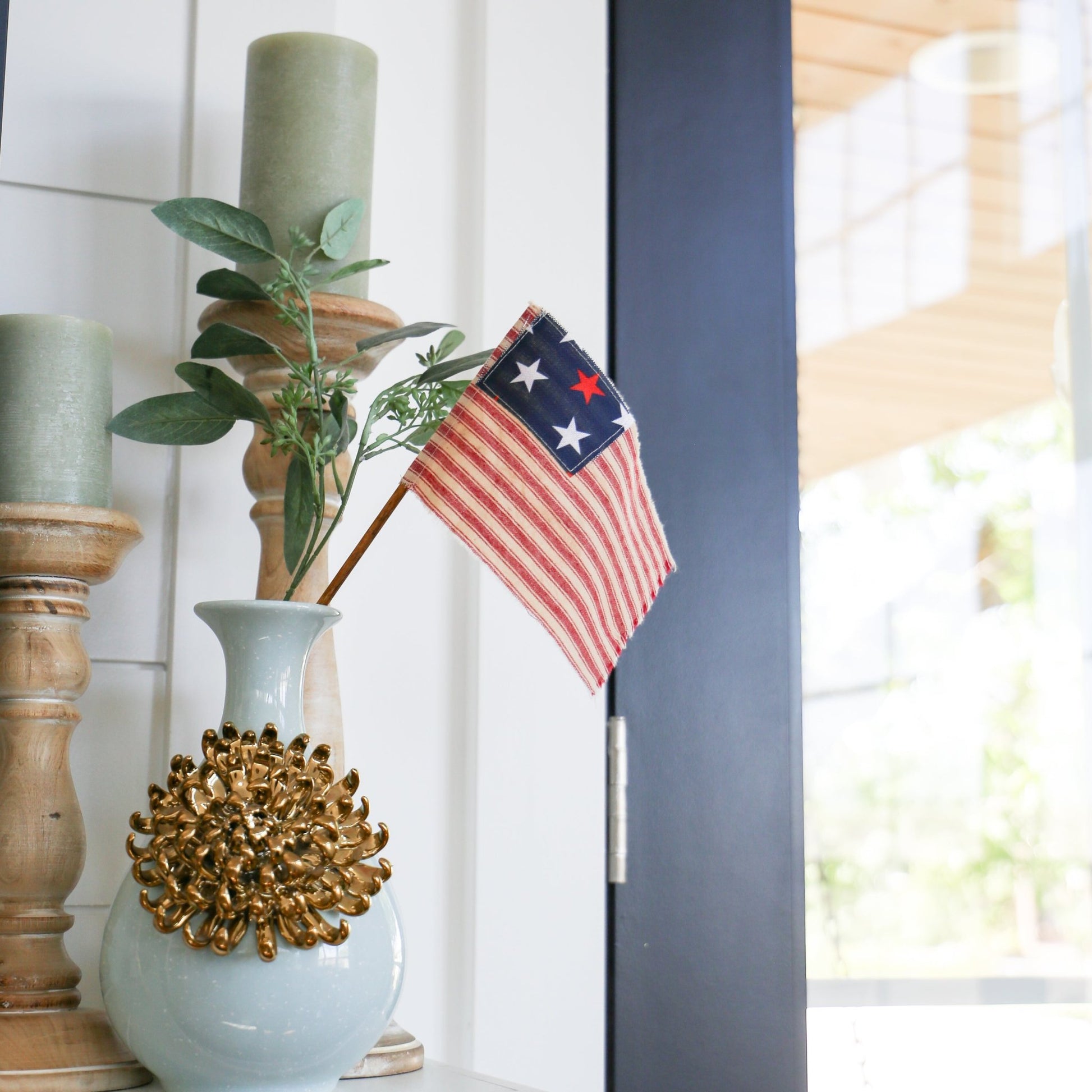 Thank you so much for your thoughtful review and for sharing such a lovely photo with us! Your Patriotic Fabric Mini Flag looks absolutely perfect nestled in that beautiful floral arrangement. The entire setup is so warm and welcoming—it captures the sweet, nostalgic charm that we love so much about this piece.