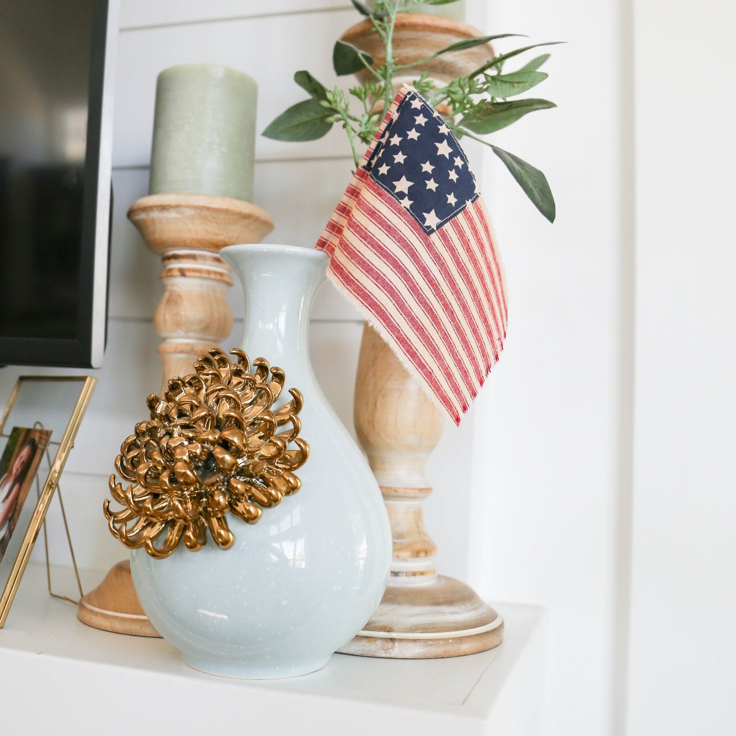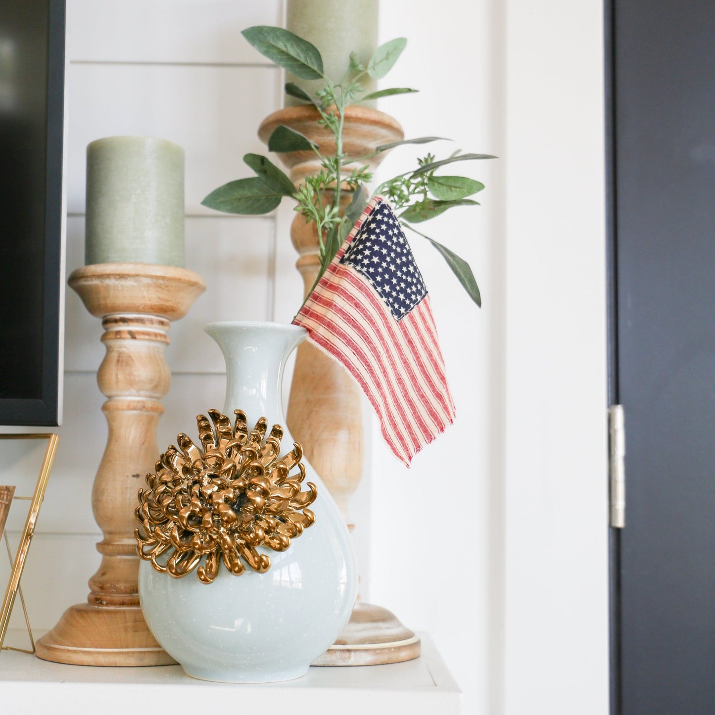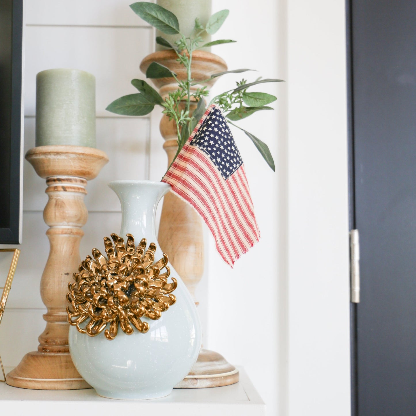 Thank you so much for your thoughtful review and for sharing such a lovely photo with us! Your Patriotic Fabric Mini Flag looks absolutely perfect nestled in that beautiful floral arrangement. The entire setup is so warm and welcoming—it captures the sweet, nostalgic charm that we love so much about this piece.