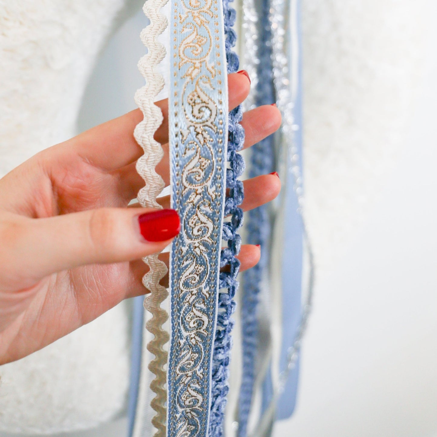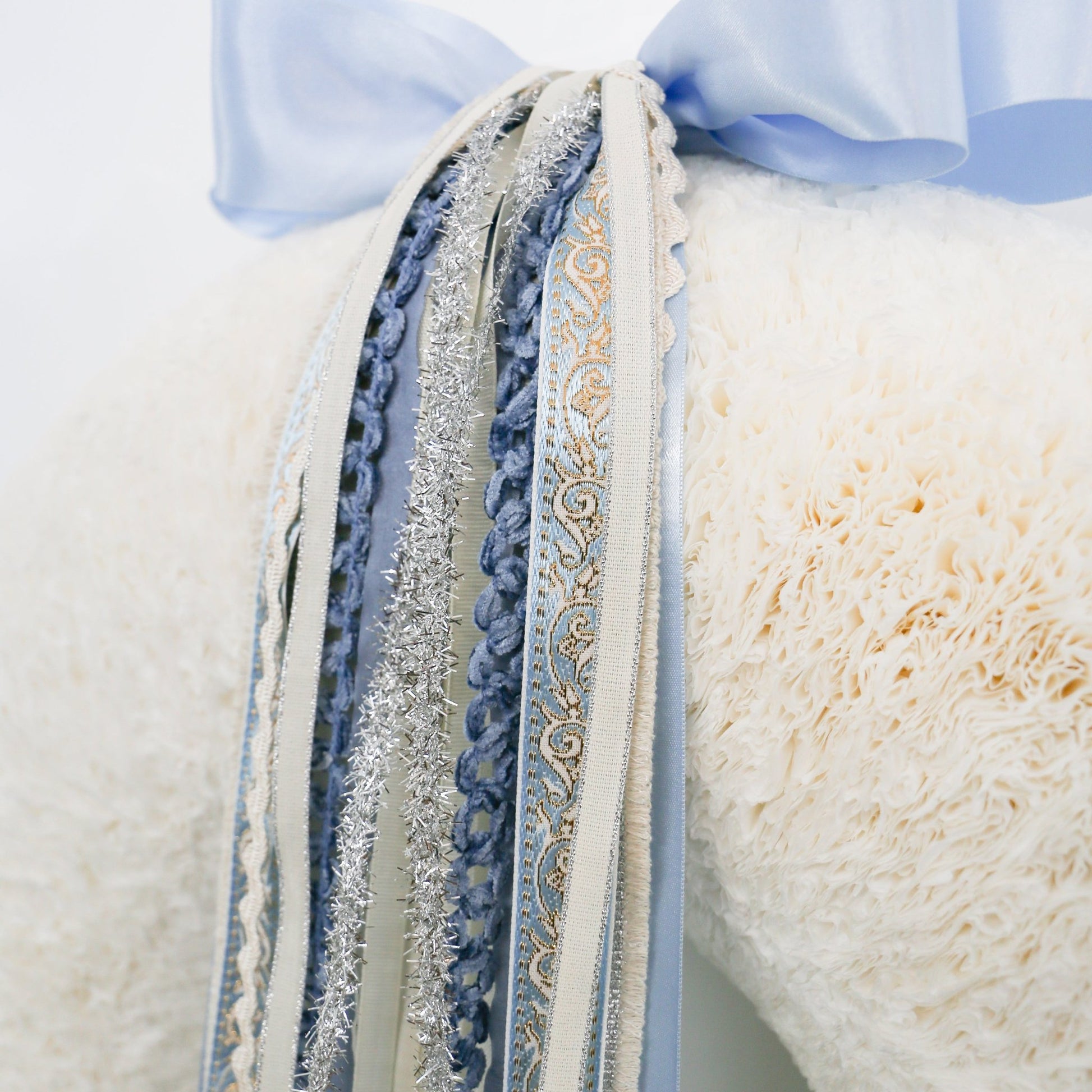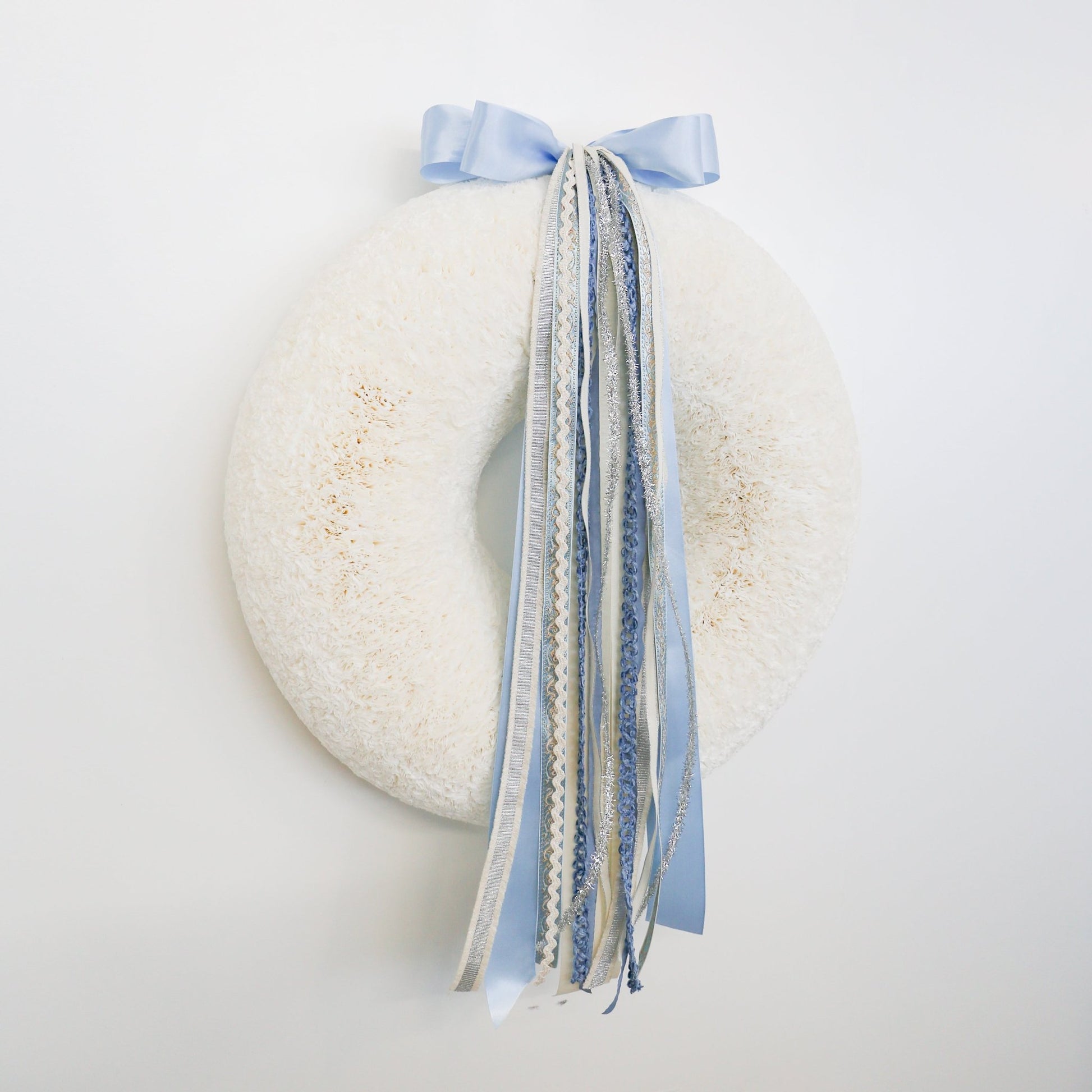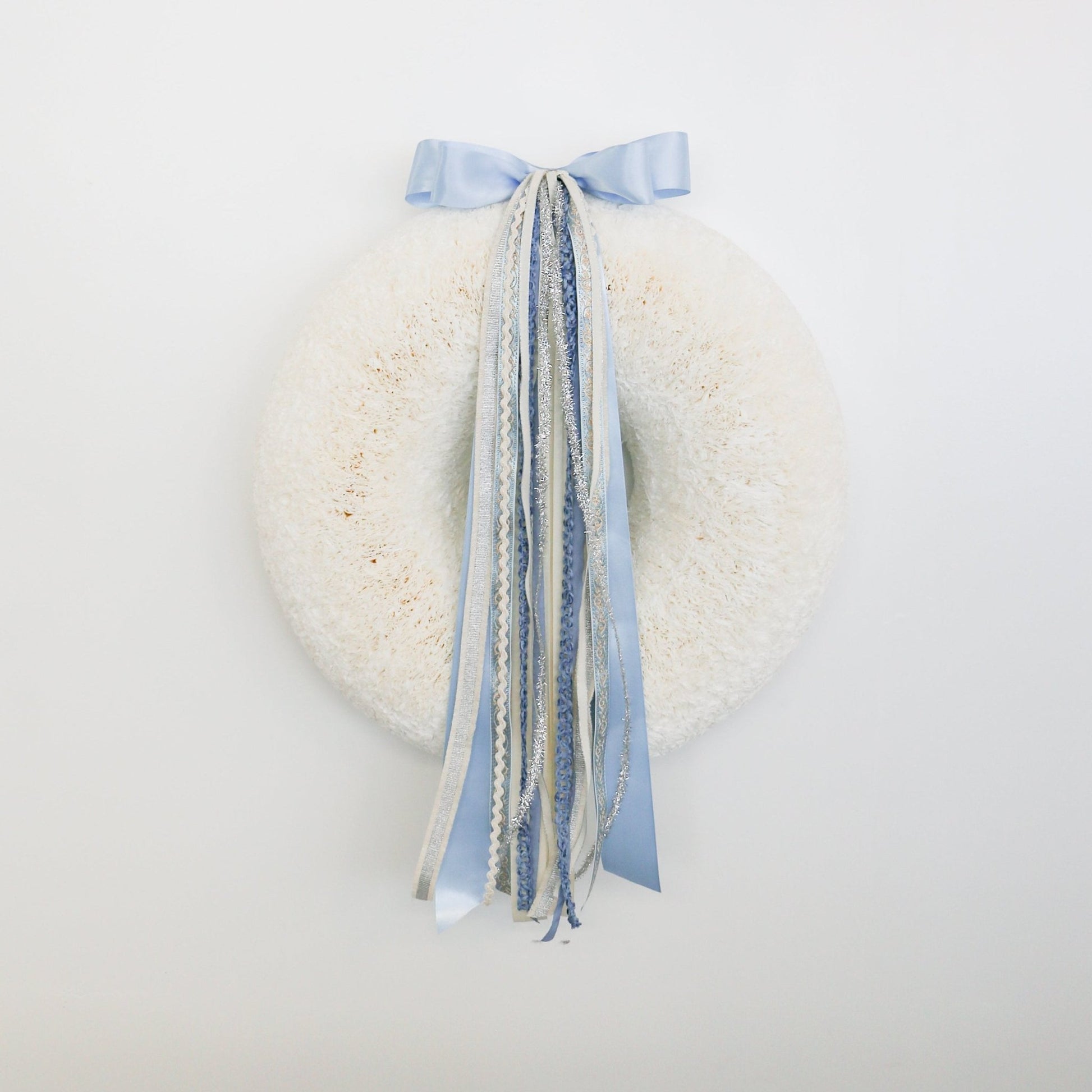 Snowfall Serenade RIBBON SET™ (with Double Bow) Soft satin blues set the tone for this elegant collection, complemented by winter whites and shimmering silver accents. This set captures the sparkle and magic of the New Year with its stunning tinsel ribbon and intricate blue and silver embroidery. The serene, calming essence of winter is beautifully reflected in this design, making it the perfect way to welcome guests to your front door.