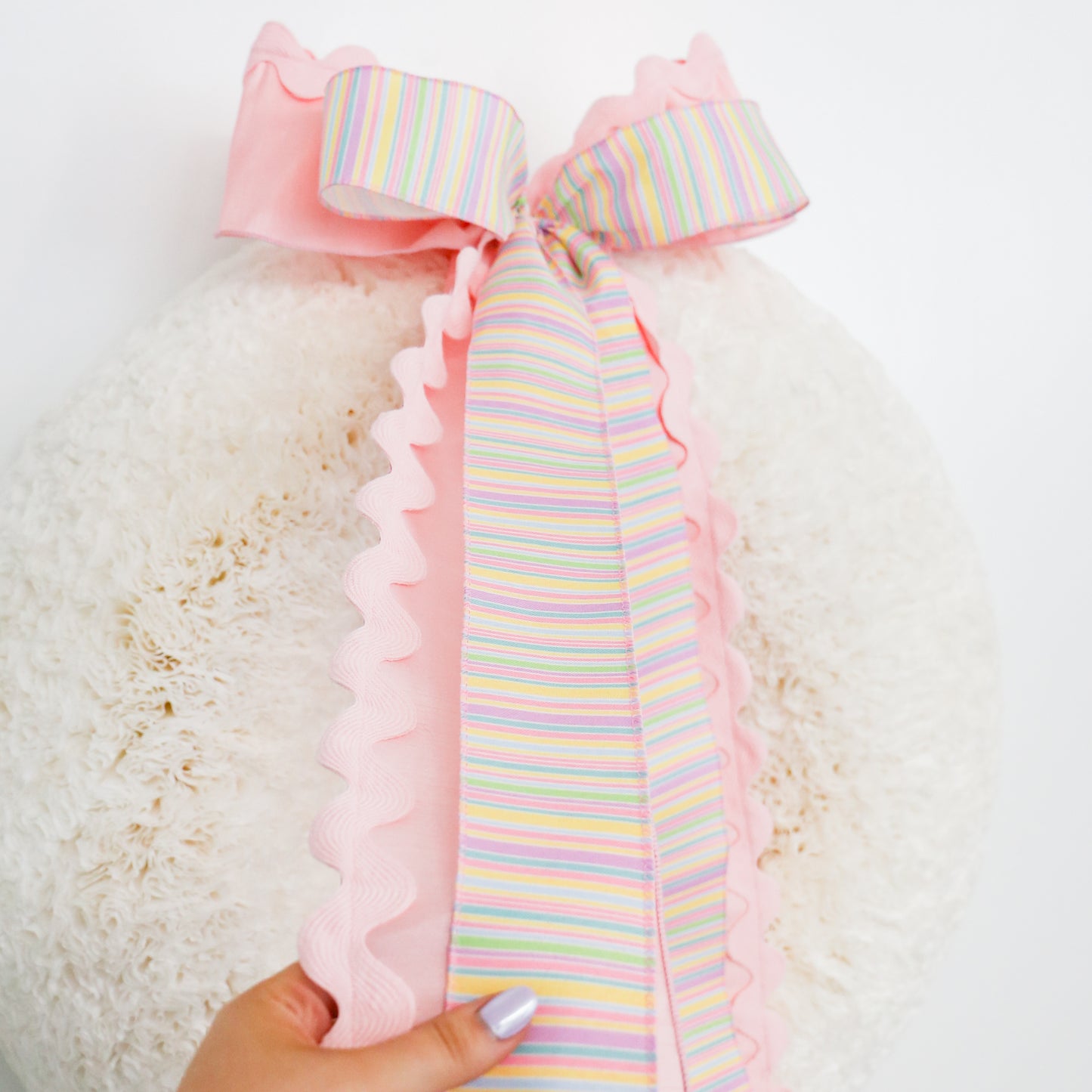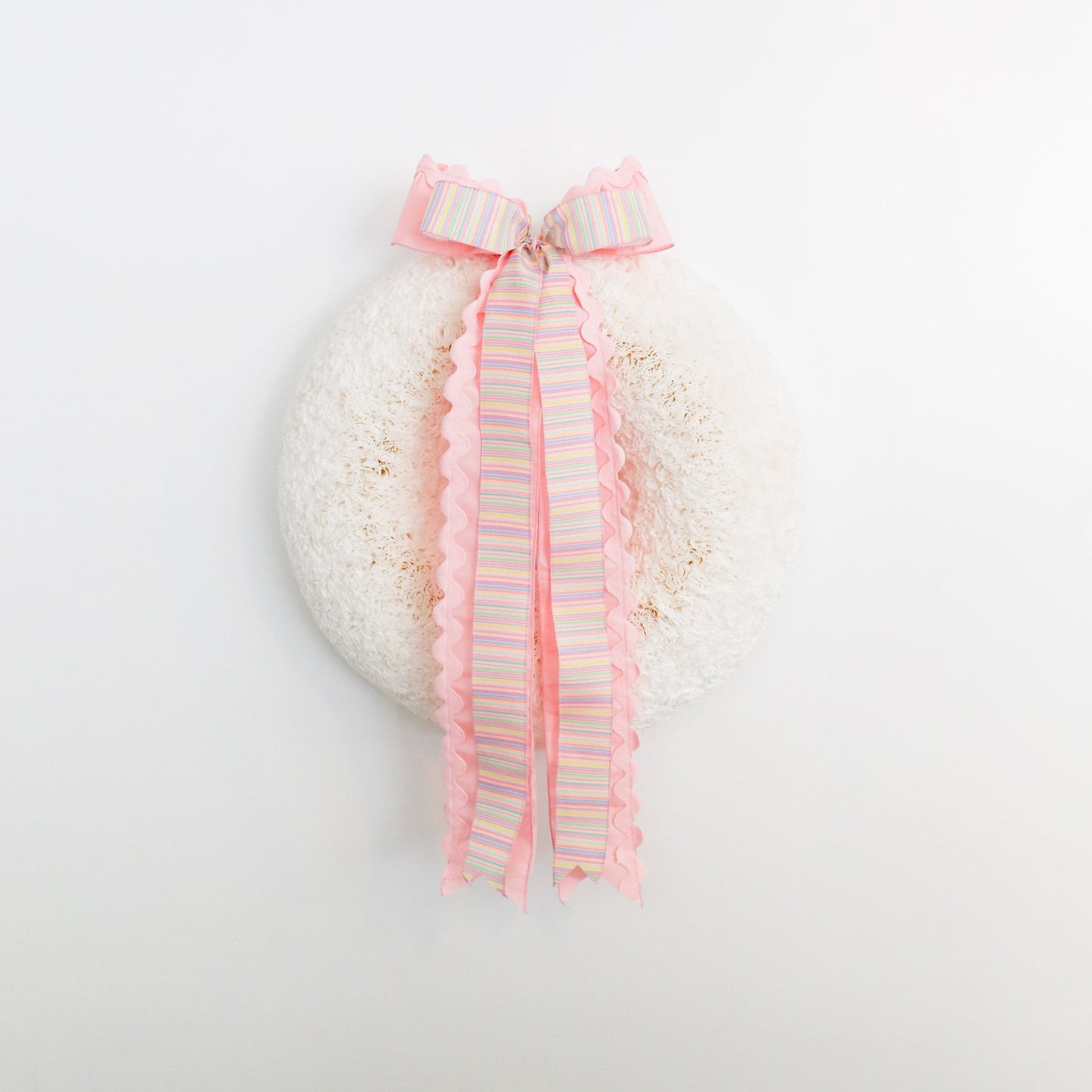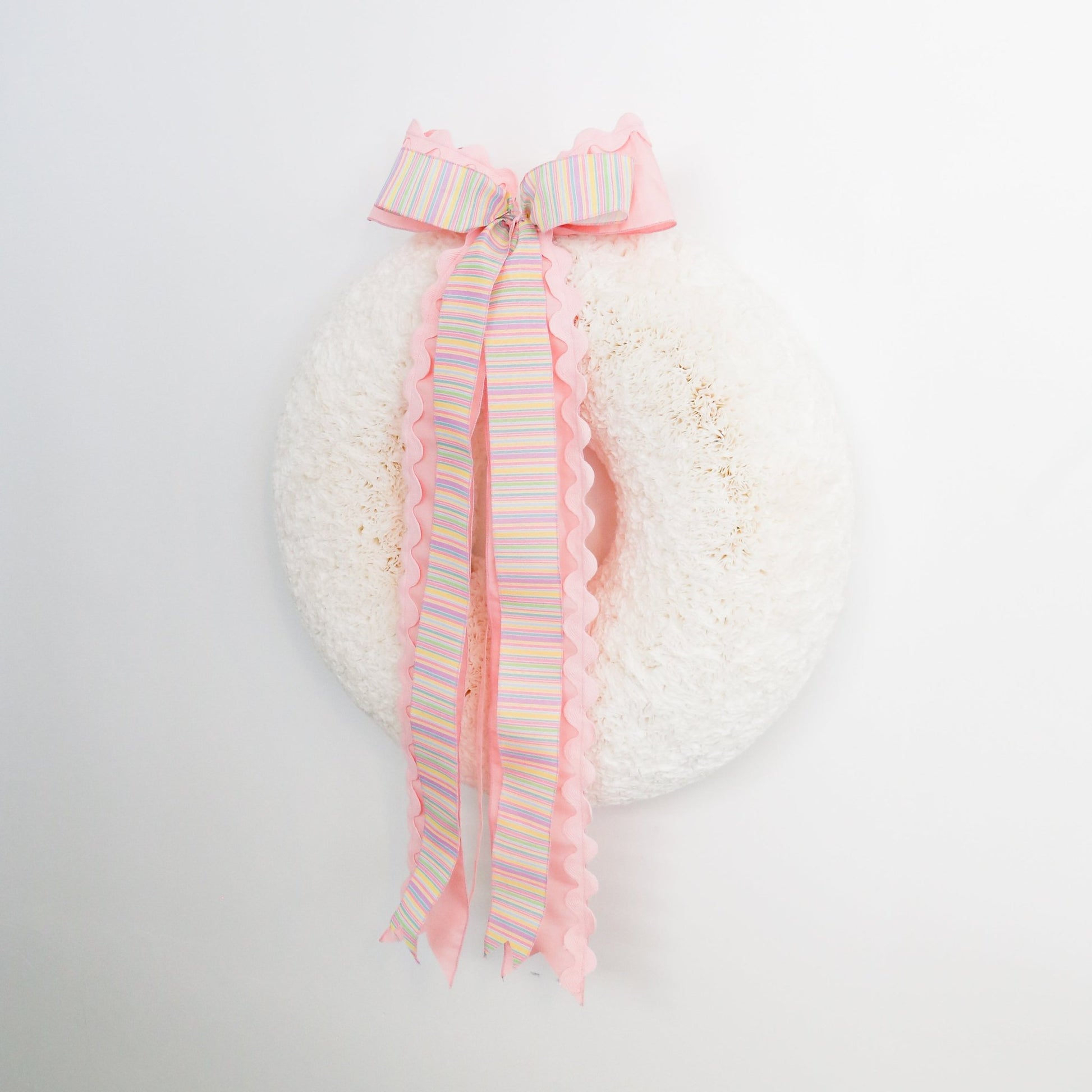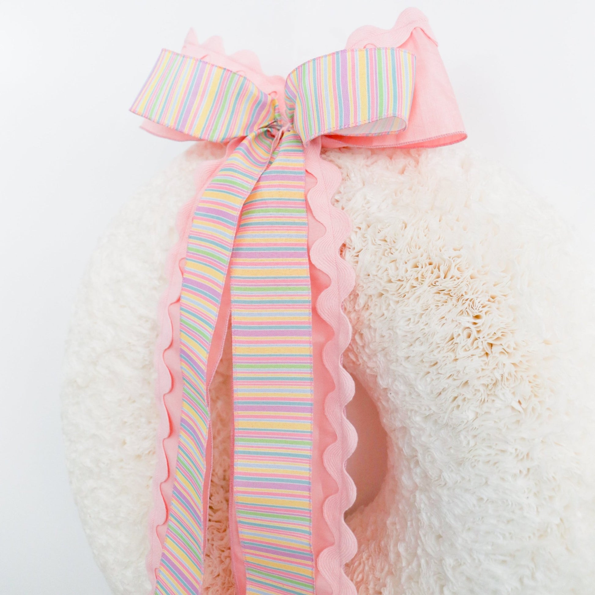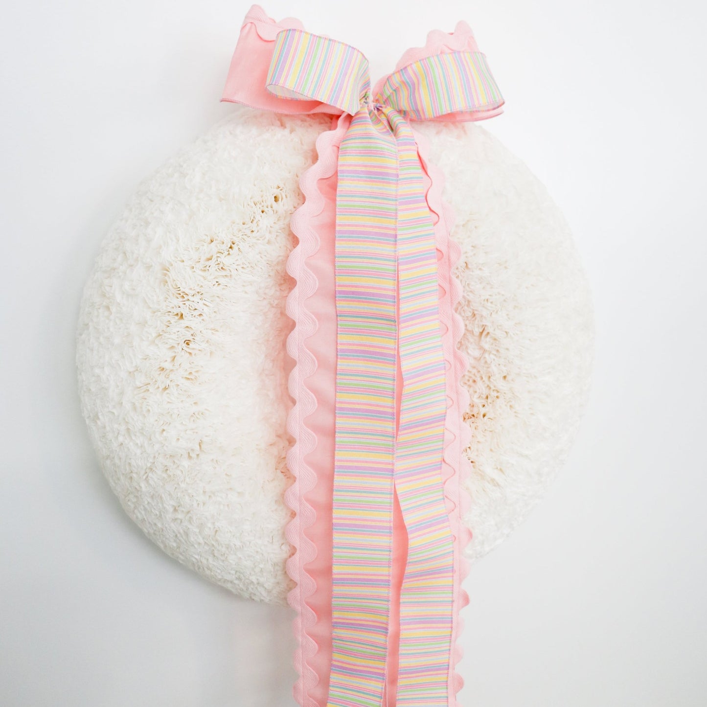 Soft, elegant, and timeless, the Turtle Creek Lane Bow features a 2.5-inch pastel-striped wired ribbon, allowing for perfect shaping and a structured, polished look. It is delicately layered over a 4-inch light pink faux silk Anisha ribbon, finished with a 40mm light pink Ric-Rac trim that adds a whimsical, scalloped edge for a vintage-inspired touch.